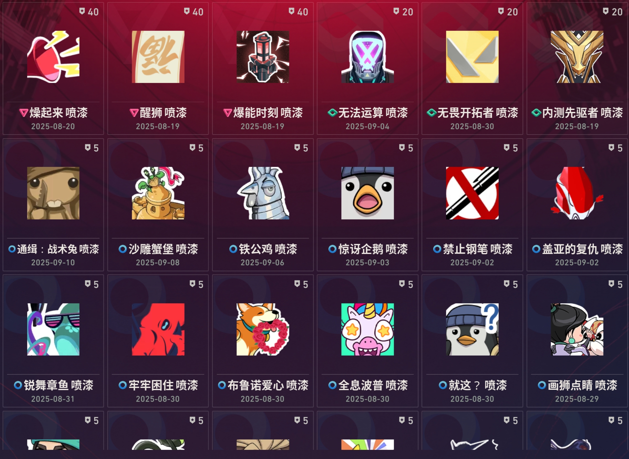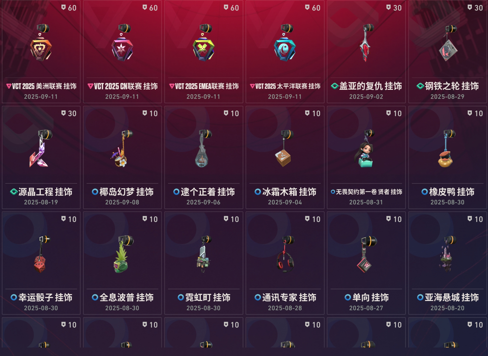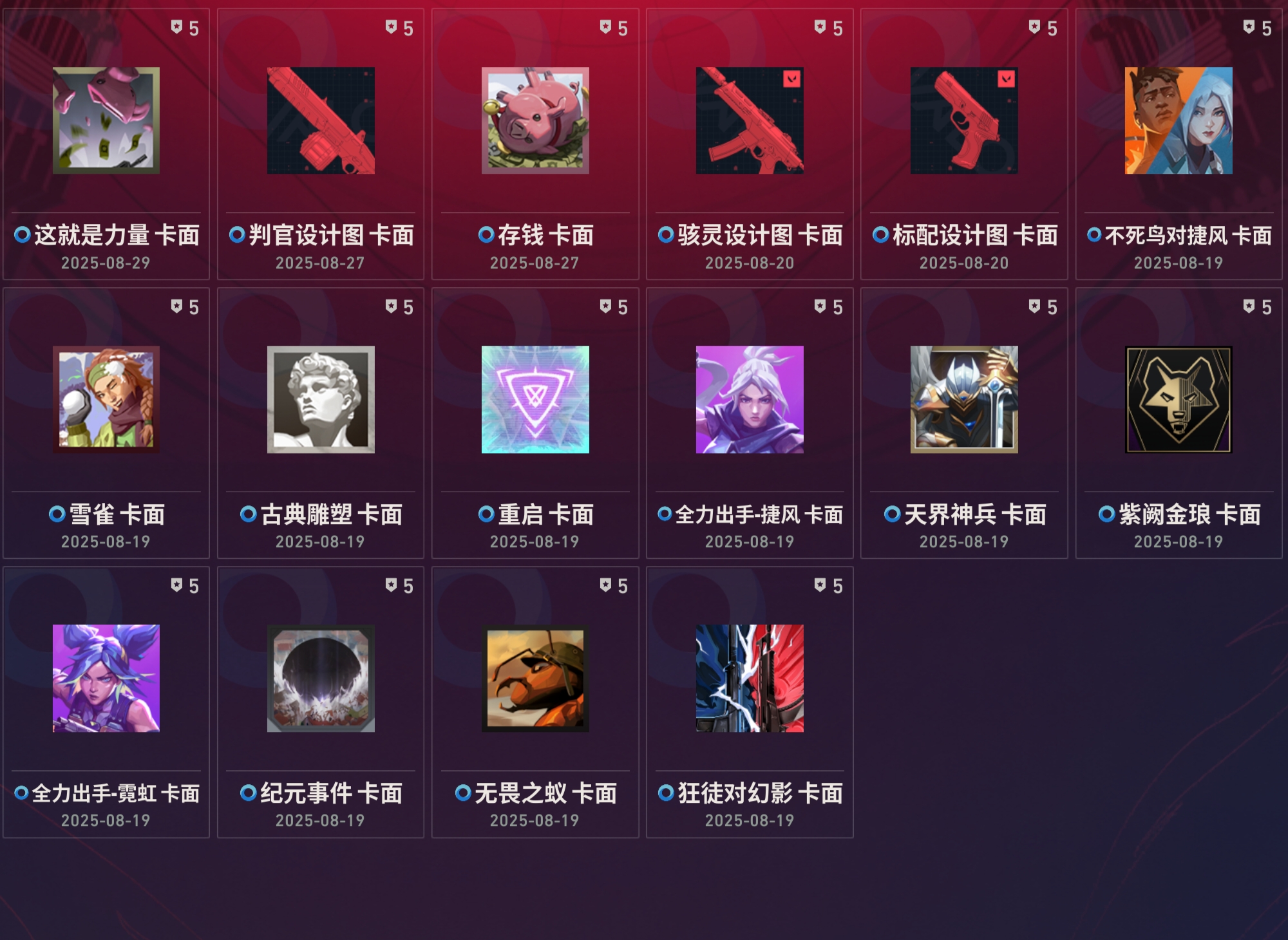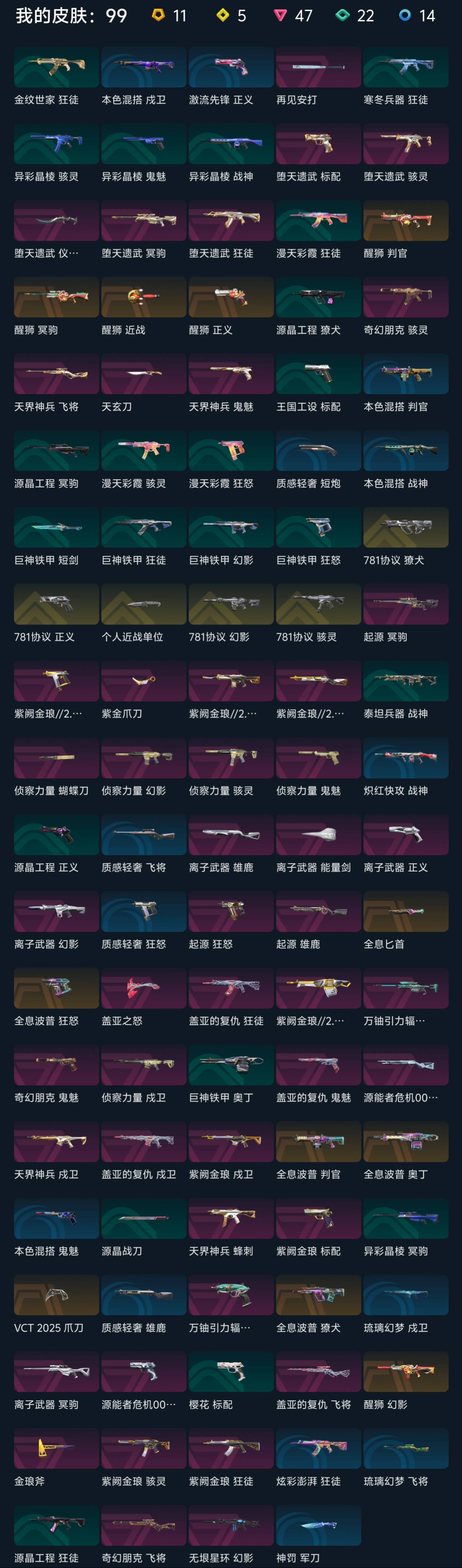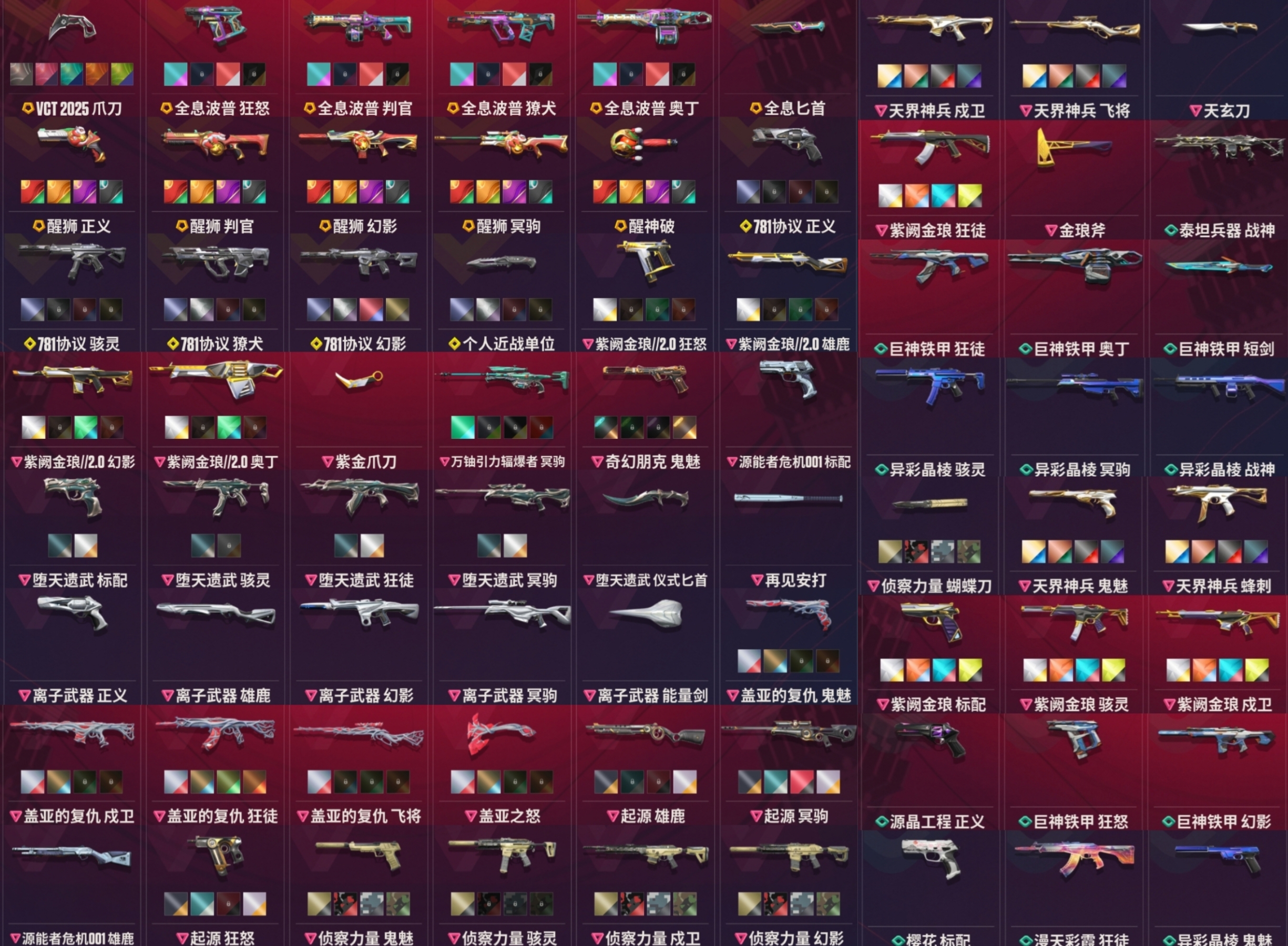 近战武器:vct2025爪刀满级全炫彩(vct爪刀)/狂沙之拥2级黑曜/紫金爪刀2级/沧澜戟2级白色深蓝/荧光刀2级蓝色/偃月2级莹白/澄湖涟滟2级鱼扇/辐爆之杖2级/无畏契约第1卷苦无2级/推进模式前进四2级黑红银蓝/堕天遗武仪式匕首2级/个人近战单位满级粉白/离子武器能量剑2级/盖亚之怒2级蓝色/全息匕首2级/醒神破2级全炫彩/天玄刀2级/侦察力量蝴蝶刀2级全炫彩(侦察蝴蝶刀)/再见安打2级/金琅斧2级/巨神铁甲短剑/放电尖刺2级/神罚军刀(神中神)