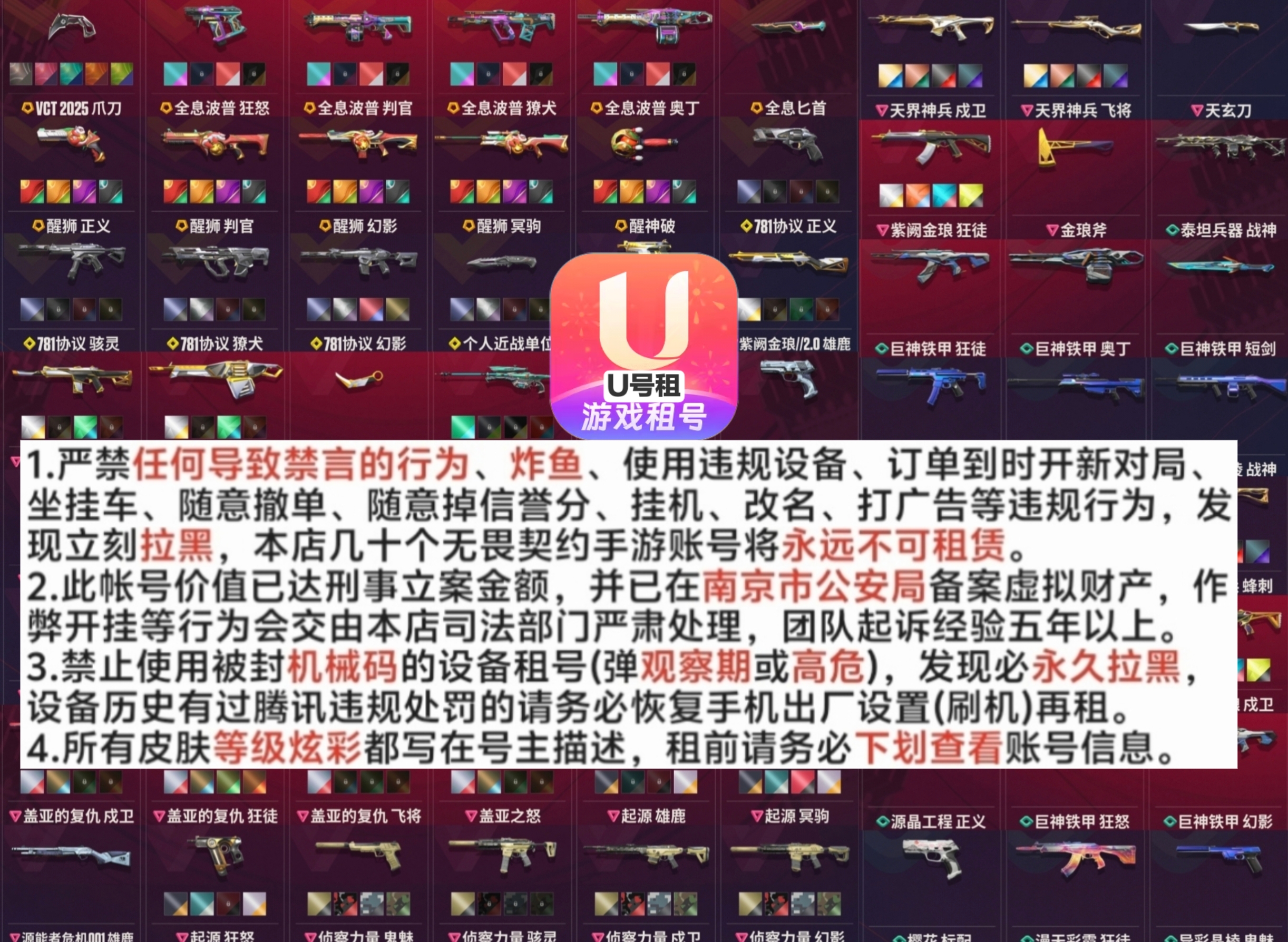 1.严禁任何导致禁言的行为、炸鱼、使用违规设备、订单到时开新对局、坐挂车、随意撤单、随意掉信誉分、挂机、改名、打广告等违规行为,发现立刻拉黑,本店几十个无畏契约手游账号将永远不可租赁。