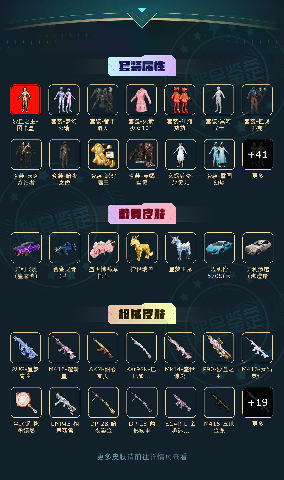 46粉,7载具,259套装,0王牌印记,历史最高段,0热力值 平底锅-林间仙鹿/平底锅-桃粉嫣然/AKM-甜心宝贝/SCAR-L-童趣迷兔/AUG-星梦奇缘/M416-全功率超战/M416-暖熊萌萌/M416-心之恋语/GROZA-超新星/M416-五爪金龙/M416-女娲灵识/SCAR-L-青春物语/M762-甜蜜誓约/AUG-超新星/M416-超新星/Mk14-盛世惊鸿/DP-28-暗夜鎏金/MG3-洛神天依/P90-能量风暴/AKS-74U-信仰神谕/P90-粉樱探戈/Vector-环太平洋/UMP45-相思残雪/UMP45-恐龙拽拽/P90-沙丘之主/汤姆逊-冰川粉黛/UMP45-启明星/烟雾弹-猫咪绅士/破片手榴弹-粉粉猫爪/Kar98K-巳巳如意/Kar98K-未来歌姬/宾利飞驰(皇家紫)/宾利添越(浅瞪羚棕)/合金龙骨(蓝)/迈凯伦570S(天际蓝)/护世瑞兽/星梦玉骢/盛世惊鸿摩托车/