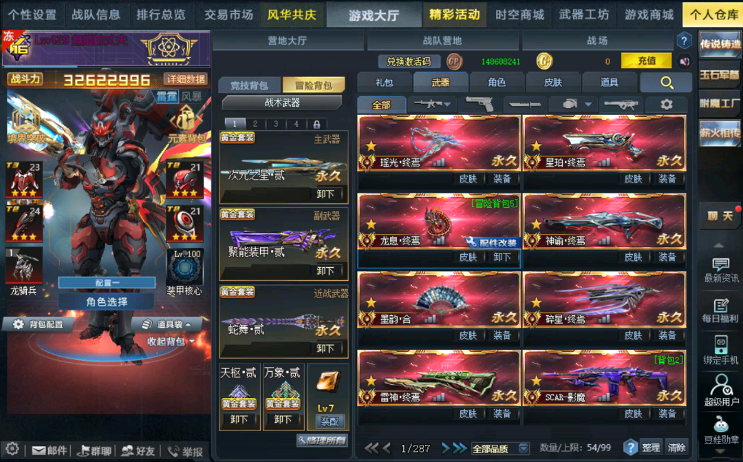 传说武器:瑶光终焉◆星珀终焉◆RPK主宰◆龙息·终焉◆神谕·终焉◆AK47主宰◆墨韵·合◆碎星·终焉◆雷神·终焉◆SCAR-影魔◆无尽光影·终焉◆M4A1无限EX◆屠魔◆AK47天神◆