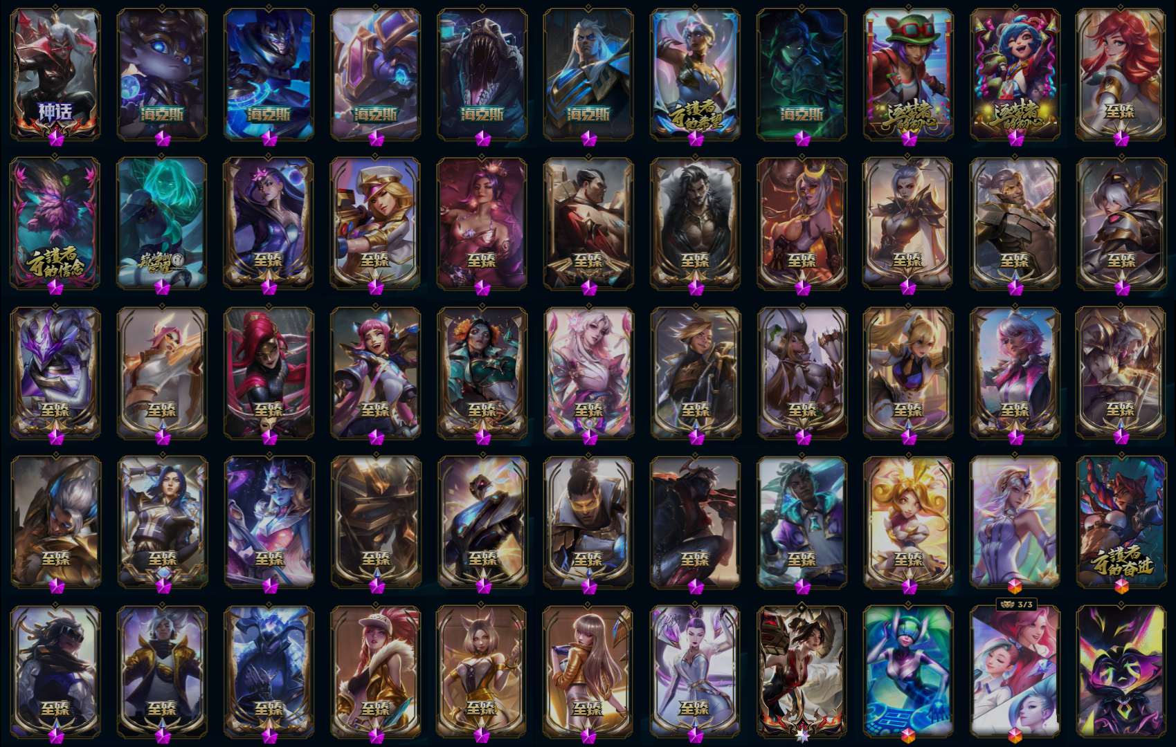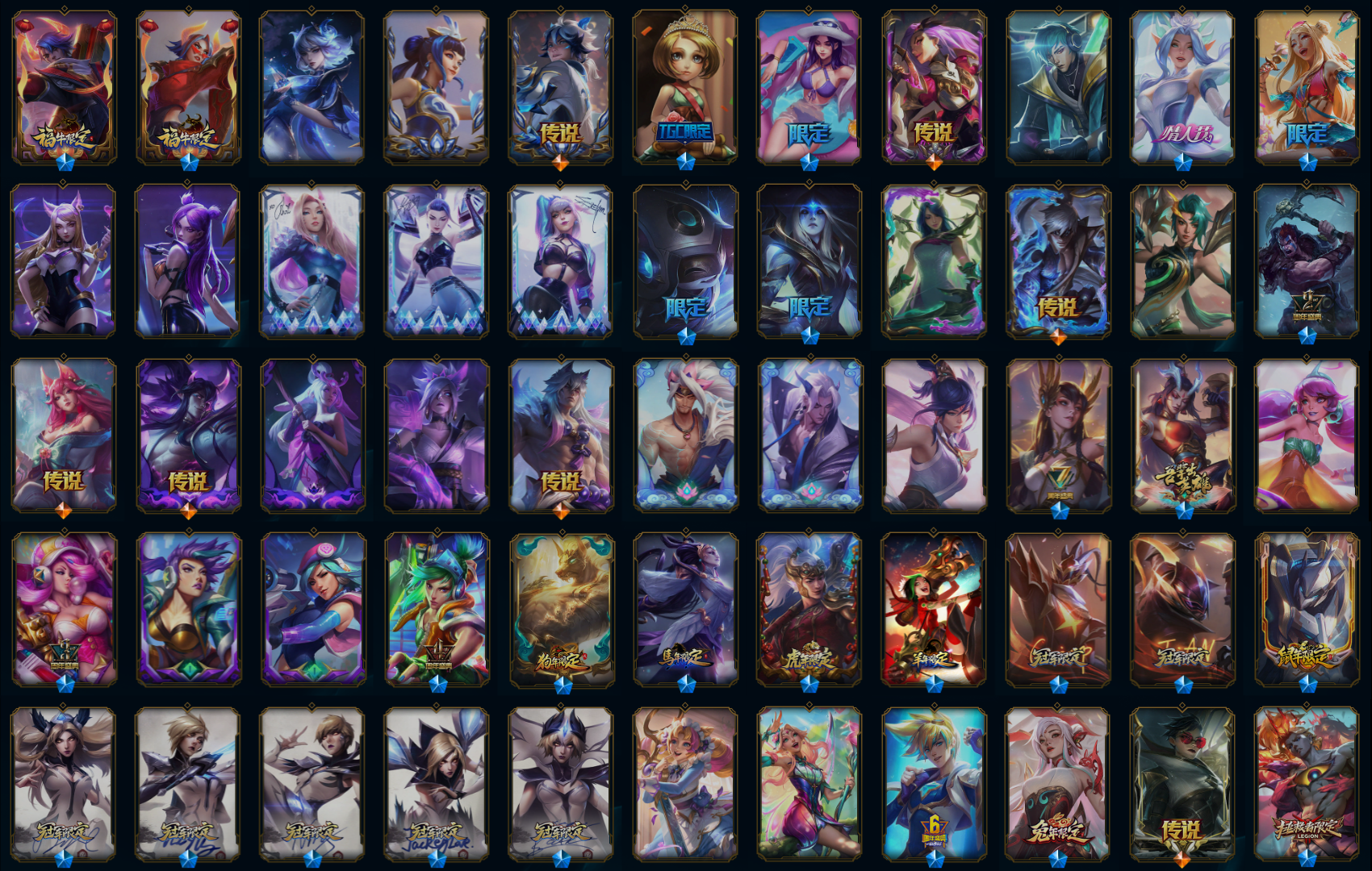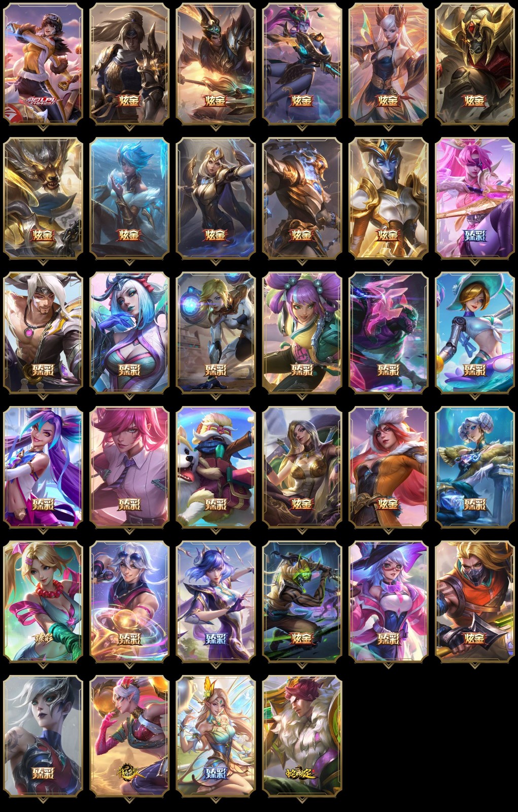 【传说皮肤】约德尔国队长提莫 灵魂莲华瑟提 盒子猫萨科 战斗学院霞 神龙尊者夜月幻龙亚索 上古战魂魔腾 钢铁军团盖伦 绝息圣堂锐雯 海魔至尊亚托克斯 鬼魂新娘莫甘娜 枯萎之壤泽拉斯 未来战士凯特琳 源计划毁灭派克 提莫约德尔人的一大步 暗星女王拉克丝 灵魂莲华阿狸 霸天异形卡兹克 地狱之门卫士加里奥 钢铁之翼凯尔 战斗学院伊泽瑞尔 腥红之月鬼武姬阿卡丽 西部天使赛娜 律政大亨蒙多 黎明使者锐雯 灌篮高手德莱厄斯 女警狙击凯特琳 魔幻卡牌崔斯特 丧尸布兰德 电玩女神娑娜 战斗学院凯特琳 恶魔之刃泰达米尔 黑夜使者亚索 神王德莱厄斯 冰霜亚龙希瓦娜 偶像歌手阿狸 苍穹之光韦鲁斯 双重冰晶艾尼维亚 苹果机器人布里茨 驯龙炮手崔丝塔娜 金牌主播德莱文 冰川巨兽墨菲特 绅士科加斯 宇航员诺提勒斯 黎明使者索拉卡 星之守护者金克丝 焰尾妖狐阿狸 女帝卡特琳娜 烈焰雄心崔丝塔娜 欧米伽小队幽灵特工 炼狱魔犬内瑟斯 神王盖伦 源计划林易 星之守护者拉克丝 冰霜之刃艾瑞莉娅 大天使长米迦勒凯尔 邪鸦魅影乐芙兰 奥德赛凯隐 死亡骑士盖伦 第三类接触黑默丁格 暗星锤石 暗星尊烬 战场女武神凯尔 最终BOSS维迦 黑夜使者索拉卡 光明哨兵薇恩 光明哨兵格雷福斯 女校长菲奥娜 战地机甲厄加特 霸天零式赛恩 恶魔男爵瑞兹 银河魔装机神兰博 神龙尊者圣龙李青 灵能特工娑娜 泳池派对吉格斯 黯黑魔龙希瓦娜 黯晶凤凰艾尼维亚 合金巨兽努努和威朗普 天煞劫 耀星女神拉克丝 月蚀骑士蕾欧娜 战地巨兽科加斯 血石领主弗拉基米尔 西部天使艾希 源计划泯灭雷克顿 神拳李青 蔷薇绅士杰斯 红色男爵库奇 源计划联合艾希 星之守护者洛 源计划净化薇恩 地狱行者孙悟空 日蚀骑士希维尔 星之守护者霞 屠龙勇士潘森 源计划超体莫德凯撒 灵魂莲华锤石 驯龙学者黑默丁格 西部魔影卢锡安 青花瓷伊泽瑞尔 女皇艾希 符文战熊沃利贝尔
