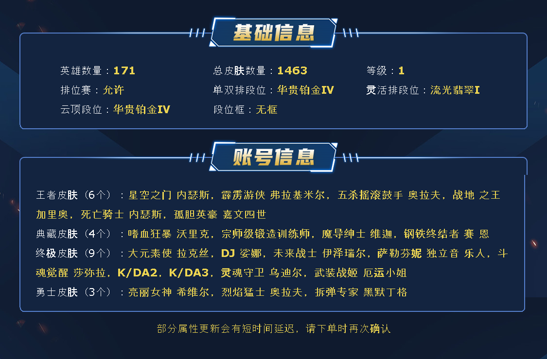 ~~喜欢记得收藏~~可排位~~1446皮全英雄丨950原皮496炫彩~~租之前尽量查一下游戏ID,确保段位是您需要的,避免浪费您的时间~~请勿挂机逃跑故意送人头,谢谢合作,谢谢~~