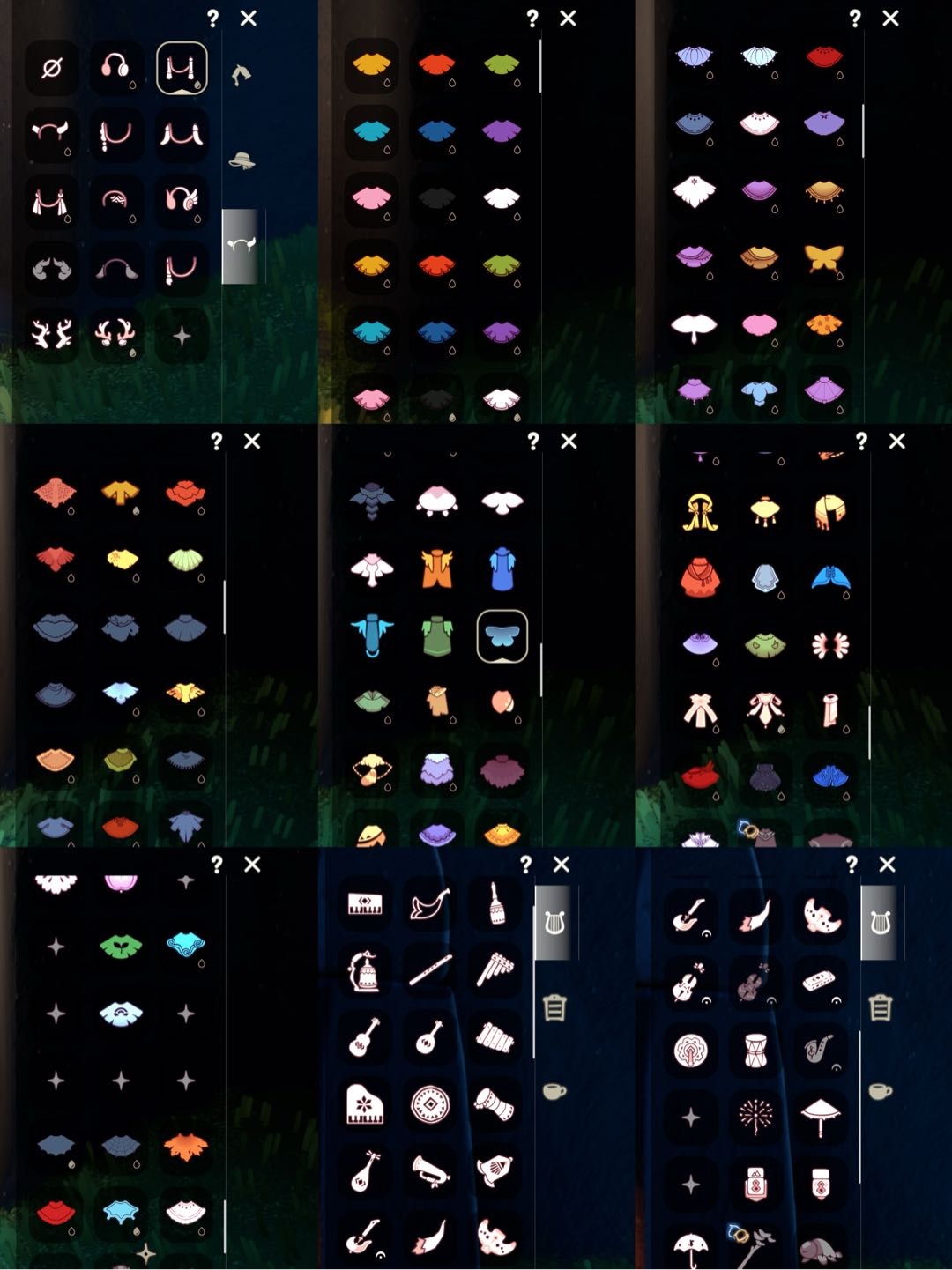 【毕业季】魔法季,圣岛季,预言季,梦想季,集结季,小王子季,风行季,潜海季,表演季,破晓季,欧若拉,追忆季,夜行季,拾光季,归巢季,九色鹿,筑巢季,二重奏季,姆明季,彩染季,青鸟季,双星季【稀有礼包】女巫裙,跃动跑鞋,巫树犄角,圣诞鹿角,温暖绒帽,彩虹帽,巫师帽,蜘蛛朋克头,贝壳发饰,蓝色音乐符,雪花发夹,兔子发饰,大橘大利,鲤跃龙门,四叶草头饰,TGC斗篷黑,创始人斗篷,福娃礼包,年年有鱼礼包,蝙蝠斗,蛛丝斗篷,瑞雪斗篷,白雪斗篷,绊爱斗,中秋灯笼,情人秋千,花憩茶桌,情人小船,冥龙南瓜,雪花水晶球 【毕业物品】阿拉丁帽,双边耳坠,毕业手碟,鳐鲲斗篷,手拍大鼓,阿努比斯,凤凰面具,凤凰斗篷,队长面具,双耳锅帽子,小号,斜边队长斗篷,小王子发型,小王子套装,玫瑰花,多羽发饰,羽袖长袍,潜水面具,单边小辫,暗红斗篷,,燕尾斗篷,双翼遥鲲斗,冥龙斗篷,留辫蘑菇头,高领舞服,透明蝶翼斗,肩带,追忆之书,棕熊面具,绒毛斗篷,西部帽,粗框眼镜,季卡相机,五塑彩带斗,五塑彩羽发,飘带斗篷,柔缎花边连,飞天盘发,光之子试衣,设计师长袍,二重奏三角,蓝色燕尾斗篷,二重奏海报,姆明抱枕,姆明红伞,妮妮长裙,辉光羚羊面具,彩染围巾斗篷,青鸟面饰,青鸟斗篷,蓝色星星光环,暮星斗篷 【热门复刻】绿芽,海洋斗,击剑裤,武士裤,正太头,虚荣,猫耳发型,背带裤,搓澡巾,花环长发,红耳机,箬笠,军帽,雨伞,高音钢琴,白金斗篷,黑金斗篷,红金斗篷,黄鼠狼面具