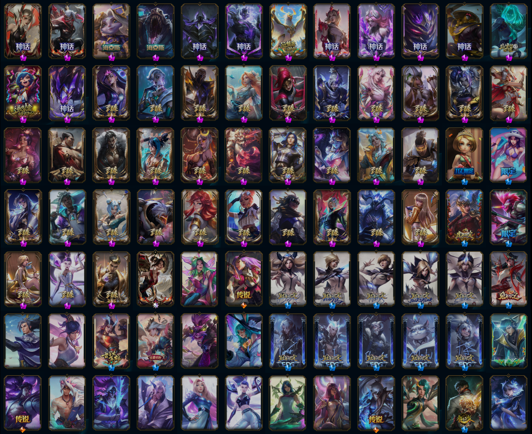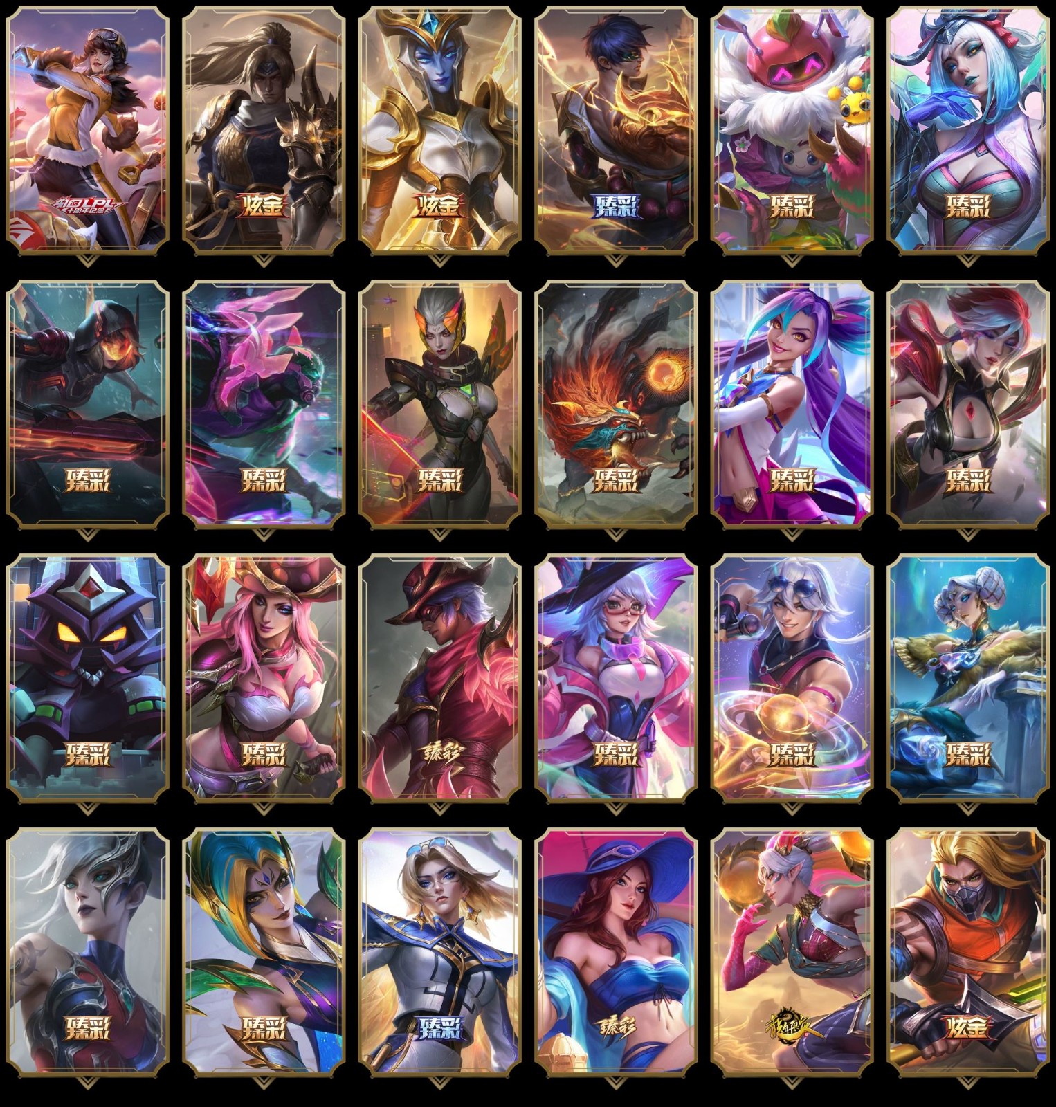 【重要皮肤】殿堂传奇卡莎 莲华温泉厄斐琉斯至臻 灵魂莲华劫至臻 灵魂莲华拉克丝至臻 凯旋将军德莱厄斯至臻 黑色玫瑰假面舞会卡特琳娜至臻 双城之战2指挥官凯特琳至臻 狼神英灵斯维因至臻 暗星女王黛安娜至臻 魔域梦魇泽丽至臻 T1杰斯至臻 至高天凯尔至臻 天龙之子伊泽瑞尔至臻 北极星钢影卡蜜尔至臻 心之钢永恩至臻 玉剑传说琴仙子至臻 斗魂觉醒派克至臻 DRX亚托克斯至臻 剪纸仙灵希维尔至臻 太空律动魔音海妖娜美至臻 星之守护者艾克至臻 海之歌萨勒芬妮至臻 神凰行者烈羽焰凰霞至臻 未来战士卢锡安至臻 真实伤害赛娜至臻 源计划阴劫至臻 神龙尊者均衡之龙沃利贝尔至臻 KDA二代卡莎至臻 KDA一代卡莎至臻 KDA伊芙琳至臻 战斗学院拉克丝至臻 烈焰美人薇恩至臻 魅惑女巫厄运小姐至臻 真实伤害奇亚娜至臻 殿堂传奇薇恩 殿堂传奇乐芙兰 灰烬守护者慎 灰烬骑士莫德凯撒 海克斯科技雷克顿 海克斯科技崔丝塔娜 新卧虎藏龙贾克斯 水晶泰坦诺提勒斯 水晶掠夺者卡兹克 水晶圣骑艾希 水晶圣骑蕾欧娜 胜利剑圣易 胜利女神娑娜 胜利之王泰达米尔 胜利巨口克格莫 舞会公主安妮 荣誉使者玛尔扎哈 电玩女神阿狸 玉剑传说神机花火 玉剑传说舞龙卫 玉剑传说翼剑仙 点心宝贝阿木木 龙的传人李青 天龙之子斯莫德 剪纸仙灵婕拉 猛虎下山赵信 你看见过我的熊猫吗安妮 虎痴之拳蔚 胜利女神瑟庄妮 胜利机器人布里茨 胜利女神奥莉安娜 胜利枪神卢锡安 胜利之剑亚托克斯 怦然心动凯特琳 觅心魔灵奥莉安娜 觅心女王艾希 觅心之翼奎因 双城之战2微光实验室辛吉德 北极星使者萨科 冬季仙境奥莉安娜 圣诞捣蛋鬼金克丝 冰封王子蒙多 魄罗骑士瑟庄妮 圣诞糖果棒厄运小姐 死亡誓约卡特琳娜 海之歌永恩 泳池派对凯特琳 泳池派对塔莉垭 泳池派对厄运小姐 电玩战魂赫卡里姆 EDG厄斐琉斯 EDG佛耶戈 EDG格雷福斯 EDG悠米 EDG佐伊 iG卡蜜尔 iG洛 iG卡莎 iG艾瑞莉娅 iG乐芙兰 iG菲奥娜 SKTT1扎克 SKTT1烬 SKTT1辛德拉 SKTT1娜美 SKTT1艾克 SKTT1奥拉夫 SKTT1瑞兹 SSW锤石 SSW雷恩加尔 SSW图奇 SKTT1劫 SKTT1婕拉 暗杀星蒙多 Fnatic库奇 Fnatic古拉加斯 Fnatic卡尔萨斯 冰雪兽纳尔 防暴机器人布里茨 防暴士兵辛吉德 防暴天使凯尔 冠军掠夺者卡兹克 冠军之矛卡莉丝塔 冠军之刃锐雯2016 冠军之血希瓦娜 鬼影森森茂凯 鬼影重重魔腾 海贼瑞兹 圣诞精灵崔丝塔娜 圣诞狂欢努努和威朗普 圣诞玩偶波比 喜庆之树茂凯 幸福女神乐芙兰 雪默丁格 野兽猎人德莱文 野兽猎人瑟庄妮 征服者卡尔玛 征服者韦鲁斯 暗影沃里克 阿木木主人不要我了 2021全球总决赛嘉文四世 波比的巧克力工坊 地底世界崔斯特 都铎王朝图奇 十五周年纪念希维尔 十周年纪念安妮 源代码乐芙兰 神凰行者瑞羽圣凰艾尼维亚 胜利凤凰艾尼维亚 灵魂守卫乌迪尔 绝息圣堂洛