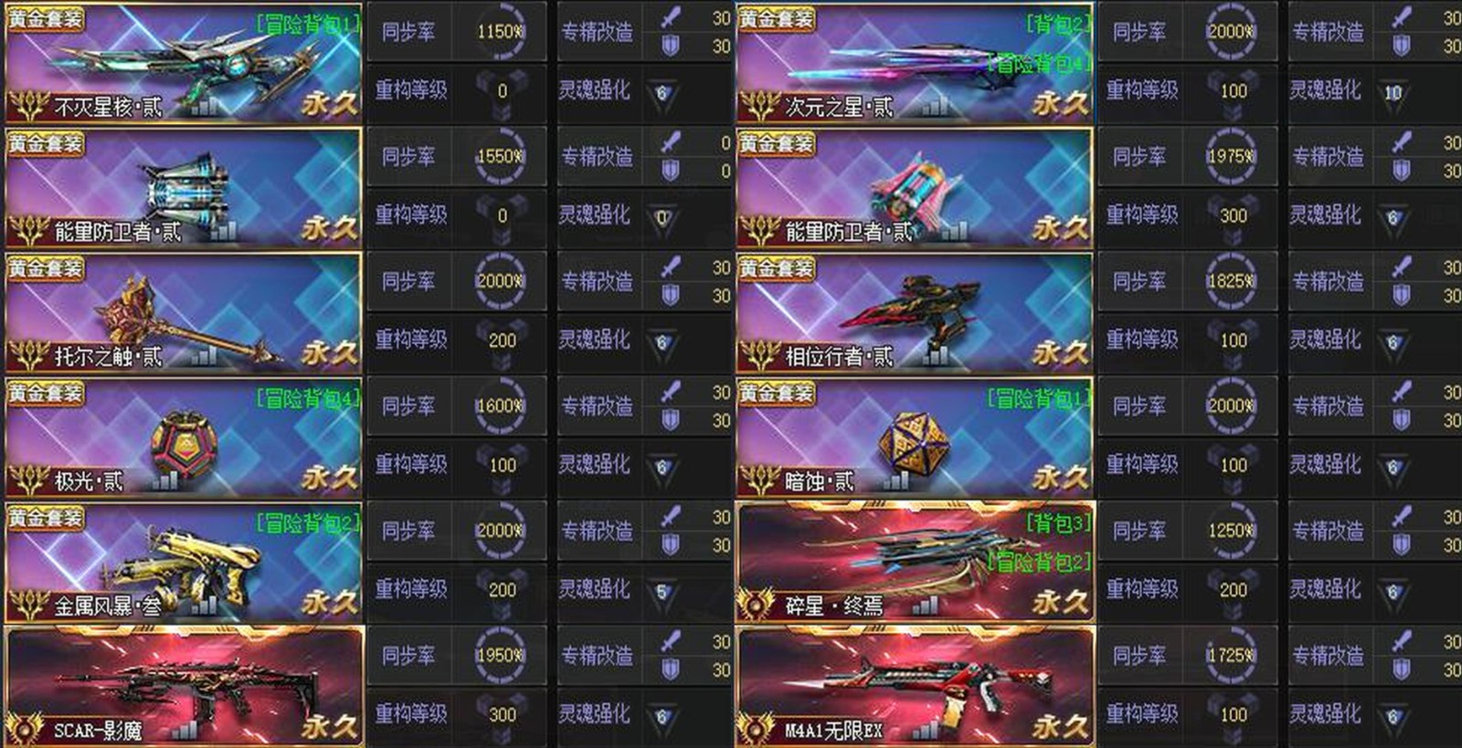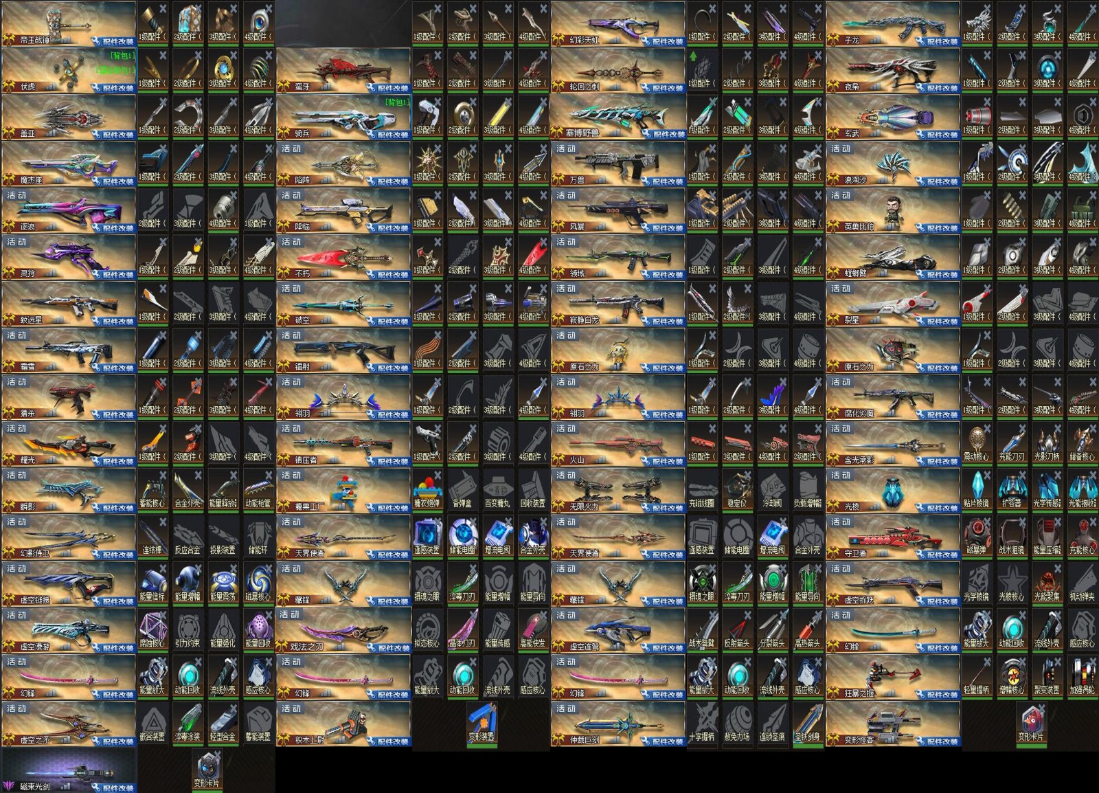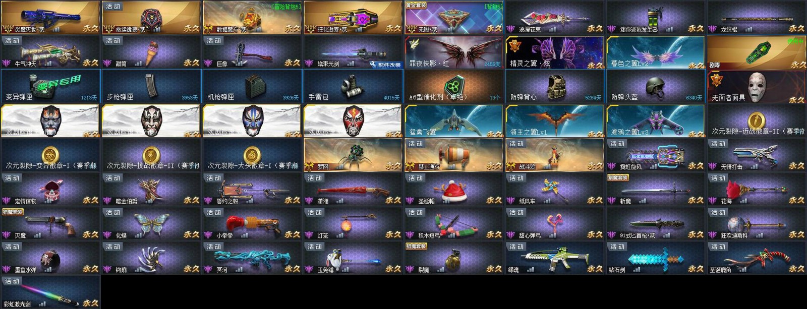 娱乐武器类:炎魔灭世•贰丨命运透视•贰丨数据魔方•贰丨狂化激素•贰丨无暇•贰丨浪漫花束丨龙纹棍丨牛气冲天丨甜筒丨巨像丨磁束光剑丨罗网丨