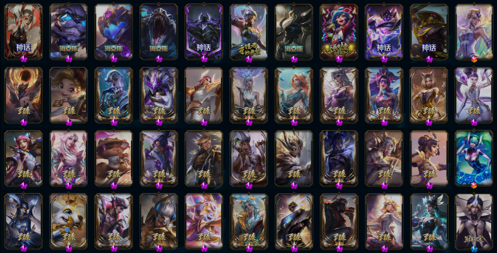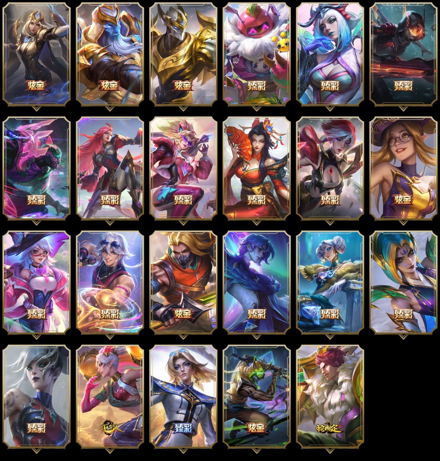 【重要皮肤】灵魂莲华拉克丝至臻 幻灵狮心蕾欧娜至臻 天龙之子伊泽瑞尔至臻 神龙尊者比翼之龙洛至臻 北极星钢影卡蜜尔至臻 斗魂觉醒萨科至臻 墨之影武者亚索至臻 花仙使者卡特琳娜至臻 青花瓷丽桑卓至臻 至高天奎桑提至臻 灵魂莲华易至臻 海珀利安小队X09星环灵风迦娜至臻 星之守护者辛德拉至臻 海之歌萨勒芬妮至臻 西部魔影猎天使恶魔泰隆至臻 幻灵战斗猫金克丝至臻 青花瓷拉克丝至臻 女帝黛安娜至臻 战斗学院蕾欧娜至臻 太空律动璐璐至臻 魔女婕拉至臻 奥术师佐伊至臻 真实伤害赛娜至臻 星之守护者索拉卡至臻 灵魂莲华提莫至臻 灵能特工伊泽瑞尔至臻 福牛守护者菲奥娜至臻 源计划逆流塞拉斯至臻 暗星墨菲特至臻 神龙尊者炎龙瑟提至臻 焰执事布兰德至臻 KDA二代卡莎至臻 KDA阿狸至臻 魅惑女巫厄运小姐至臻 绒毛菲兹至臻 未来战士锤石至臻 殿堂传奇乐芙兰 水晶巫灵泽拉斯 灰烬骑士莫德凯撒 海克斯科技雷克顿 海克斯科技吉格斯 海克斯科技拉莫斯 新卧虎藏龙贾克斯 黎明使者卡尔玛 零之枪骑赫卡里姆 战熊骑士瑟庄妮 创星之灵璐璐 荣誉使者玛尔扎哈 电玩勇者锐雯 电玩女神阿狸 女帝厄运小姐 女帝格温 玉剑传说神机花火 灵能特工易 天龙之子斯莫德 替父从军花木兰 你看见过我的熊猫吗安妮 北辰之威内瑟斯 紫金罗刹莫甘娜 广寒仙子嫦娥 司马懿仲达 烈焰美人薇恩 神龙之翼库奇 王国机神苍狼瑟提 胜利机器人布里茨 胜利枪神卢锡安 胜利之剑亚托克斯 幽梦玫瑰伊莉丝 甜心之翎洛 甜心宝贝娑娜 觅心萝莉金克丝 觅心猎手薇恩 幽梦玫瑰辛德拉 幽梦玫瑰泰隆 北极星使者彗 北极星神黛安娜 冬境仙灵索拉卡 冬季仙境奥莉安娜 雪球也能爆炸吉格斯 圣诞老人布隆 持胡萝卜的雪人易 魄罗骑士瑟庄妮 平安夜女神娑娜 魅惑女巫乐芙兰 魅惑女巫迦娜 魅惑女巫厄运小姐 魅惑女巫奈德丽 大魔法锅布里茨 死亡誓约卡特琳娜 死亡誓约劫 灵魂收割者索拉卡 海之歌艾希 海之歌奈德丽 海之歌萨勒芬妮 泳池派对厄运小姐 泳池派对菲奥娜 泳池派对蕾欧娜 斩星魔剑易 穿星魔锋赵信 御星魔矢艾希 EDG厄斐琉斯 EDG佛耶戈 FPX李青 iG乐芙兰 SKTT1烬 SKTT1辛德拉 SKTT1艾克 SKTT1瑞兹 SKTT1雷克顿 SSW雷恩加尔 SSW泰隆 SSW图奇 SSW辛吉德 SKTT1贾克斯 SKTT1劫 SKTT1婕拉 SKTT1薇恩 暗杀星奥莉安娜 暗杀星蒙多 暗杀星努努和威朗普 暗杀星伊泽瑞尔 暗杀星慎 Fnatic迦娜 冰雪节格雷福斯 防暴士兵辛吉德 防暴天使凯尔 钢铁之翼艾尼维亚 冠军典狱长锤石 冠军蔷薇乐芙兰 冠军之矛卡莉丝塔 冠军之隐劫 冠军之志瑞兹 鬼影森森茂凯 鬼影重重魔腾 海贼瑞兹 胡桃夹子萨科 惊悚派对费德提克 警用试作体K9内瑟斯 密林猎手提莫 南瓜头费德提克 女猎手希维尔 圣诞精灵崔丝塔娜 圣诞开心鬼提莫 圣诞狂欢基兰 圣诞狂欢努努和威朗普 圣诞老人古拉加斯 圣诞玩偶波比 圣诞驯鹿克格莫 外星装甲库奇 卧虎藏龙贾克斯 无头骑士赫卡里姆 喜庆之树茂凯 邪恶圣诞老人维迦 幸福女神乐芙兰 雪默丁格 雪装奈德丽 野兽猎人德莱文 野兽猎人瑟庄妮 野兽猎人泰达米尔 英勇玩具兵普朗克 永恒之森乐芙兰 勇者阿狸 暗影沃里克 阿木木主人不要我了 波比的巧克力工坊 地底世界崔斯特 都铎王朝图奇 十周年纪念安妮 源代码乐芙兰 DJ娑娜 大元素使拉克丝 未来战士伊泽瑞尔 绝息圣堂洛
