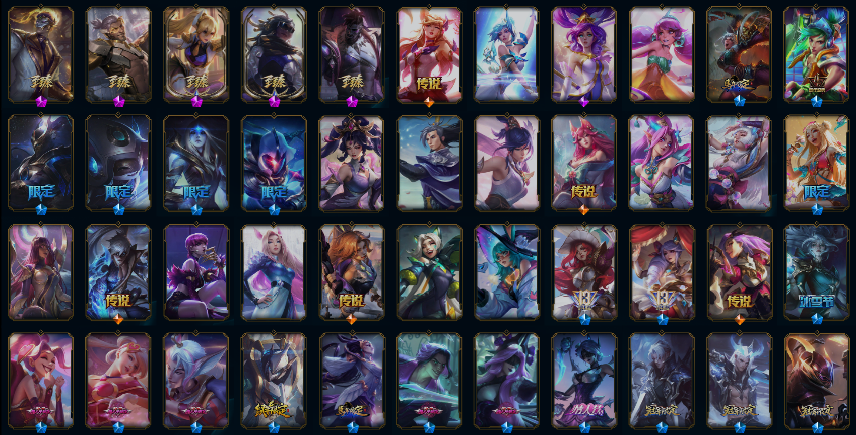 【传说皮肤】灵魂莲华阿狸 女帝卡特琳娜 邪鸦魅影乐芙兰 星之守护者阿卡丽 女校长菲奥娜 太空律动猫猫布里和里茨 西部天使艾希 冰霜亚龙希瓦娜 最终BOSS维迦 偶像歌手阿狸 钢铁军团盖伦 神龙尊者圣龙李青 霸天零式赛恩 奥德赛凯隐 星之守护者阿狸 钢铁之翼凯尔 至尊魔女莫甘娜 腥红之月鬼武姬阿卡丽 提莫约德尔人的一大步 神拳李青 灵能特工娑娜 地狱行者孙悟空 黎明使者索拉卡 黎明使者锐雯 暗星尊烬 蔷薇绅士杰斯 合金巨兽努努和威朗普 银河魔装机神兰博 黎明使者永恩 幻灵战斗队长厄运小姐 枯萎之壤泽拉斯 欧米伽小队幽灵特工 冰霜之刃艾瑞莉娅 耀星女神拉克丝 恶魔之刃泰达米尔 泳池派对吉格斯 金牌主播德莱文 电玩女神娑娜 红色男爵库奇 霸天异形卡兹克 苍穹之光韦鲁斯 焰尾妖狐阿狸 源计划毁灭派克 冰川巨兽墨菲特 女警狙击凯特琳 战斗学院伊泽瑞尔 驯龙炮手崔丝塔娜 战地机甲厄加特 战地巨兽科加斯 上古战魂魔腾 符文战熊沃利贝尔 鬼魂新娘莫甘娜 陆地王者4WD布里茨 铁哥们儿奥拉夫 屠龙勇士潘森 魔幻卡牌崔斯特 战场女武神凯尔 双重冰晶艾尼维亚 日蚀骑士蕾欧娜 月蚀骑士蕾欧娜 源计划净化薇恩 灌篮高手德莱厄斯 源计划林易 第三类接触黑默丁格 星之守护者拉克丝 恶魔男爵瑞兹 绅士科加斯 律政大亨蒙多 大天使长米迦勒凯尔 苹果机器人布里茨 黯黑魔龙希瓦娜 约德尔国队长提莫 宇航员诺提勒斯 地狱之门卫士加里奥 炼狱魔犬内瑟斯 女皇艾希 黯晶凤凰艾尼维亚 源计划联合艾希 星之守护者金克丝