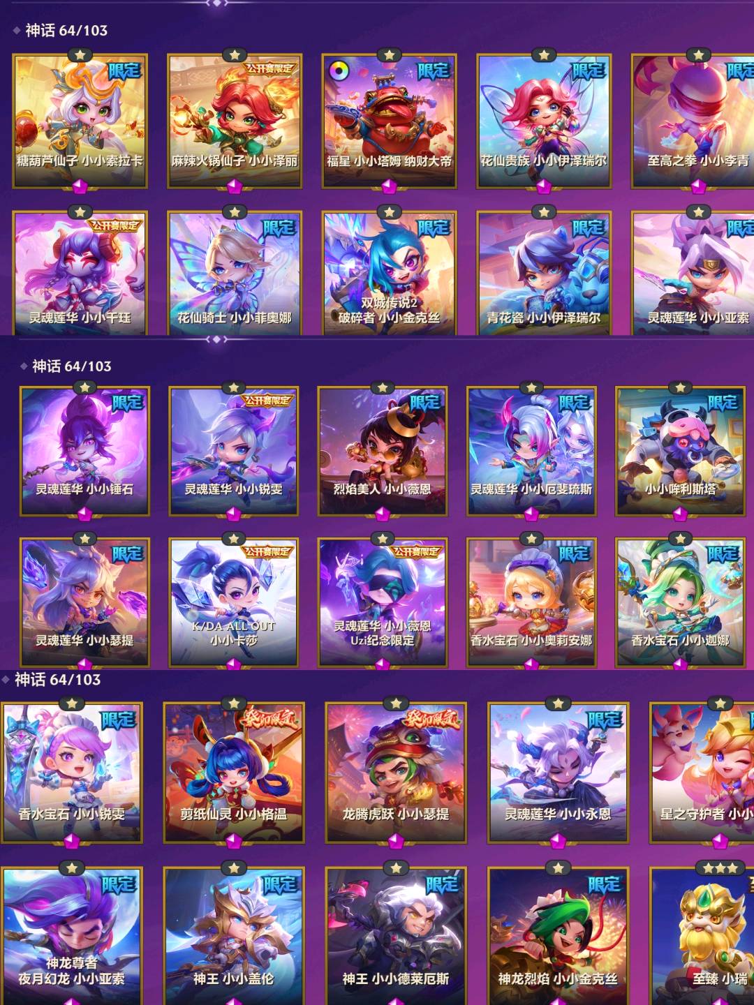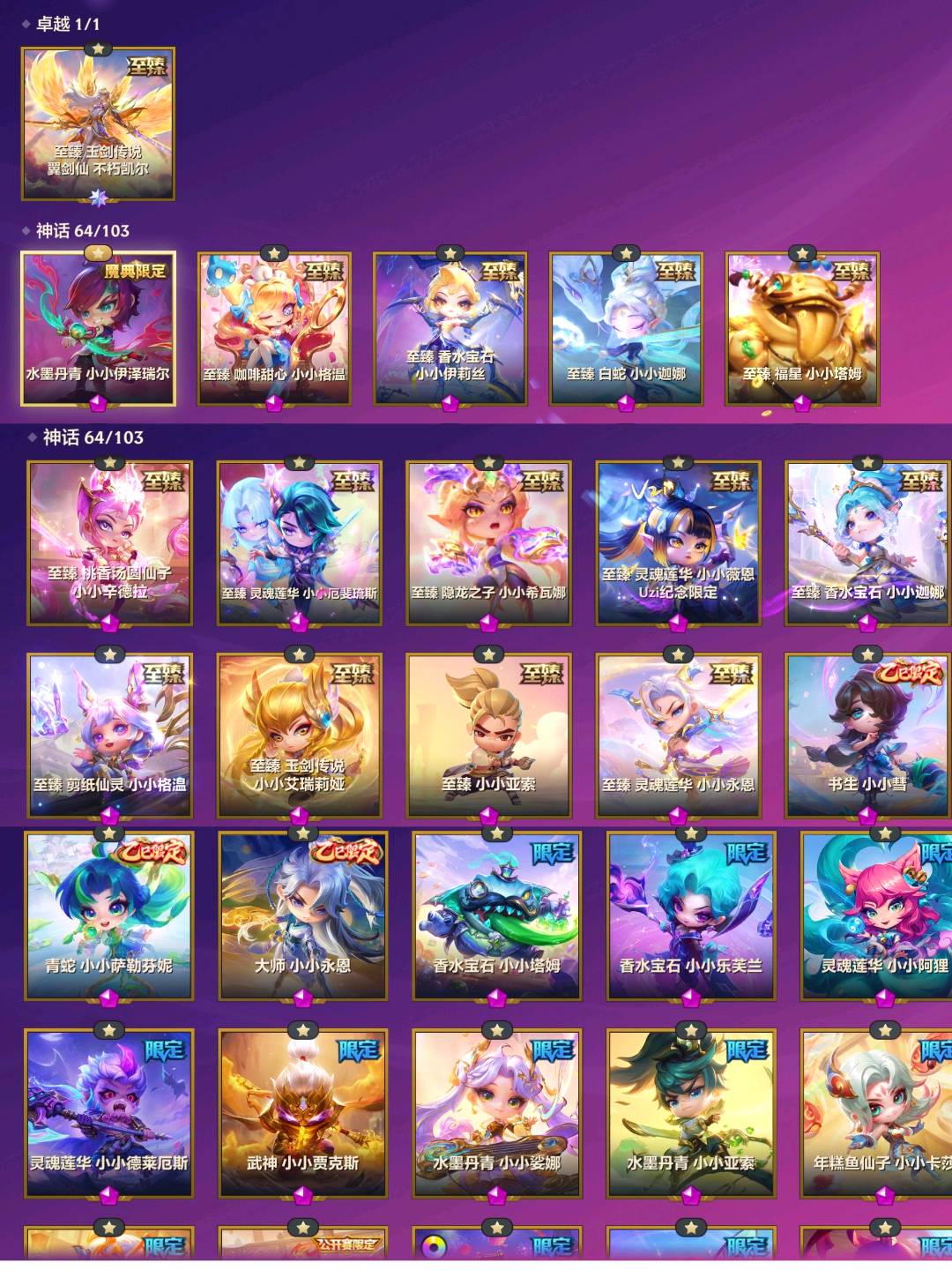 神话64至臻 香水宝石水墨丹青小小伊泽瑞尔圣臻 咖啡甜心 小小格温小小伊莉丝至臻 白蛇小小迎娜福星小小塔姆