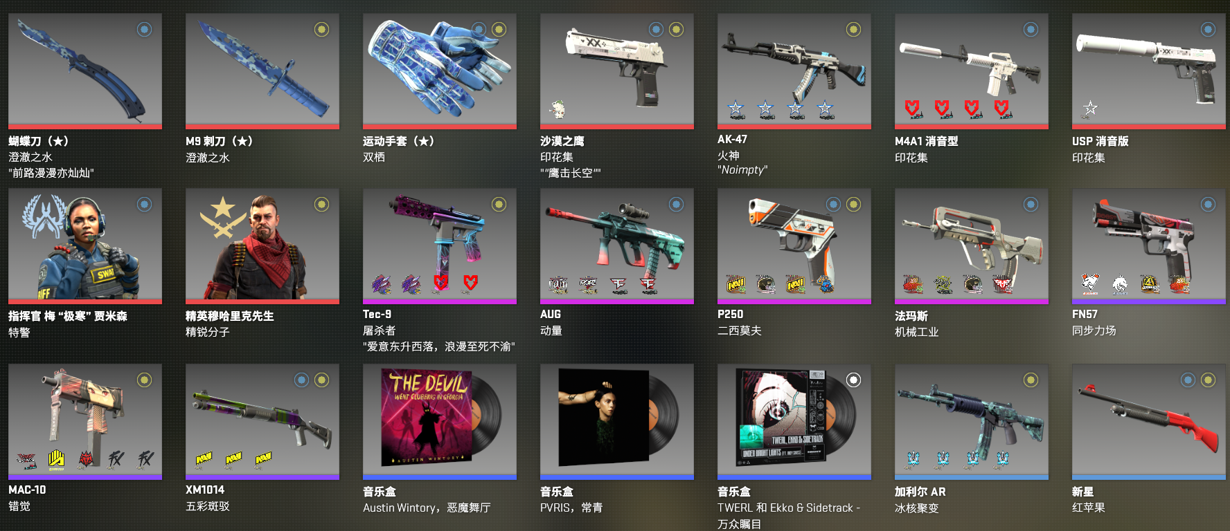 【当前段位:B+:1601-1750】完美老兵/5E❤️双刀澄澈之水❤️蝴蝶刀❤️M9刺刀❤️双栖手套❤️火神❤️印花集套❤️二西莫夫