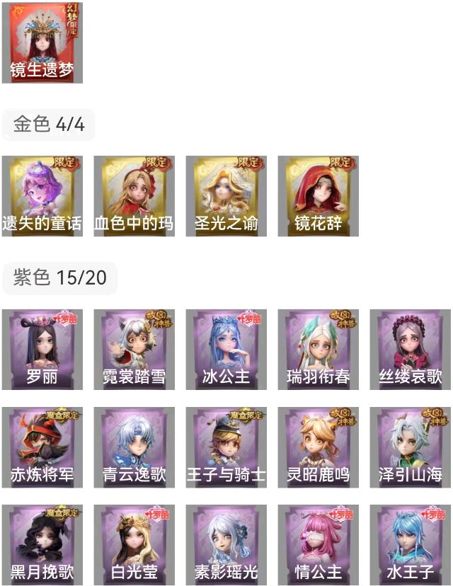 【紫色皮肤】巫铃儿-素影瑶光、阿念-王子与骑士、阿念-灵昭鹿鸣、薇薇安-白光莹、薇薇安-黑月挽歌、零-青云逸歌、零-赤炼将军、逍遥-泽引山海、爱丽丝-冰公主、爱丽丝-瑞羽衔春、爱丽丝-丝缕哀歌、小黄-罗丽、小黄-霓裳踏雪、莉莉-情公主、艾伦-水王子
