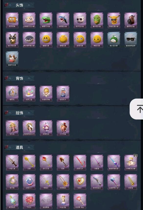 【道具皮肤】刺刀-小鲨匕首、铲子-龙鳞、铲子-圣心之泪、铲子-焰骨、桃木剑-凤鸣九禾桃木剑-永眠曲、桃木剑-最后的独角长鞭-小狗蛇点点鞭、传送按钮-昆仑镜、传送按钮-幻宠之门、摸金符-祝祷词摸金符-花落精绝、腰包-宝剑八、短管猎星光的裁决、专业手电-云端梦想计划、葫芦-伏妖塔、黄牛能量饮料-青玉抱丹、额外的背包-飞花令、夜视仪-金丝眼镜、音响-happy猫、荧光棒-桃心【头饰】炙热烧烤、小狗蛇点点头套、鳄霸天头套、咬咬鲨头套、驼半仙头套、鱼头怪头套、烈焰红唇头套、面具马头套、哈士奇头套、萨卡班甲鱼头套、嘻嘻头套、滑稽头套、呆滞头套、卑微头套、粽小宝头套、像素朋克墨镜、哞哞牛头套【背饰】蝶恋花、云梦之星、天使的呼唤、
