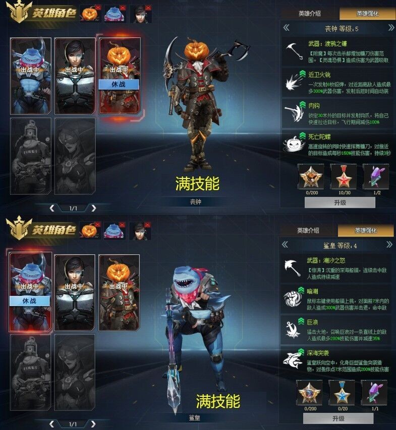 英雄角色:丧钟(满技能)、鲨皇(满技能)