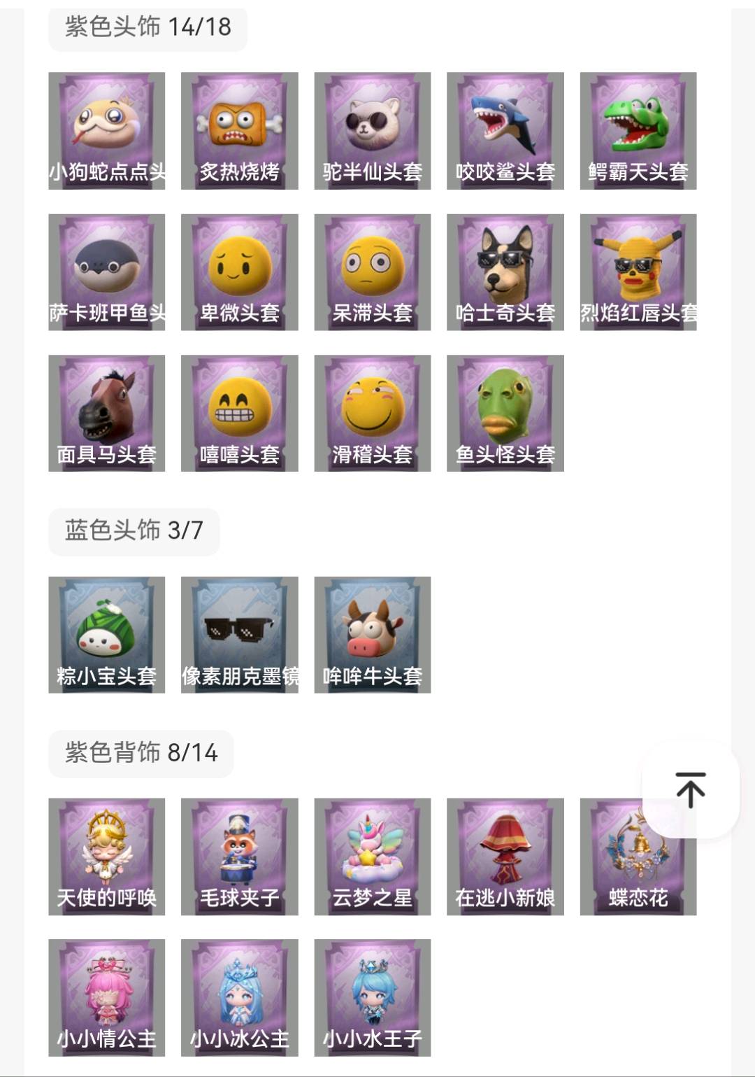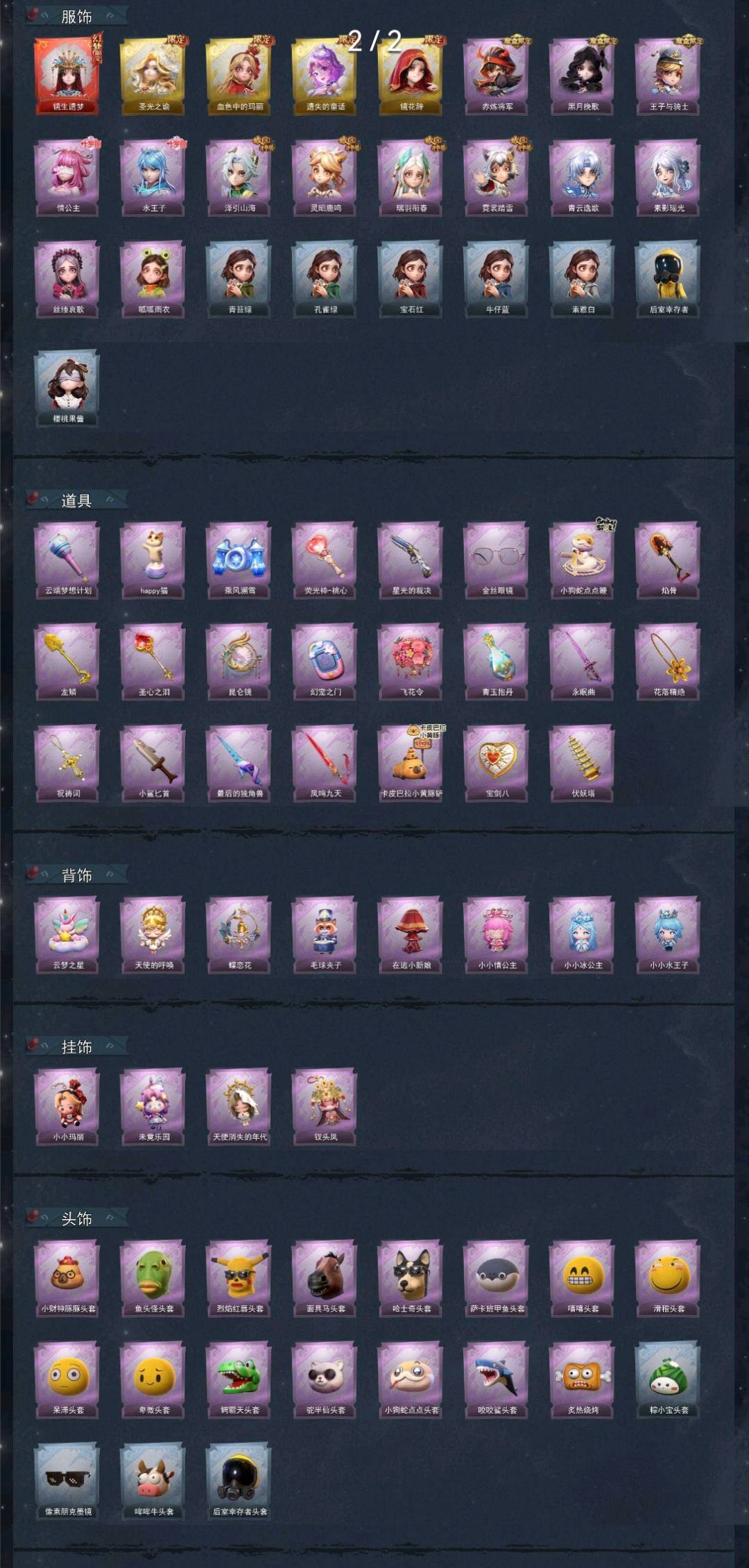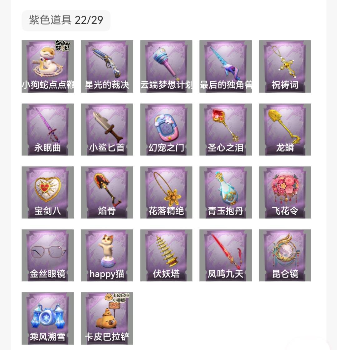 【紫色皮肤】零﹣赤炼将军、薇薇安﹣黑月挽歌、阿念﹣王子与骑士、莉莉﹣情公主、艾伦﹣水王子、逍遥﹣泽引山海、阿念﹣灵昭鹿鸣、爱丽丝﹣瑞羽衔春、小黄﹣霓裳踏雪、零﹣青云逸歌、巫铃儿﹣素影瑶光、爱丽丝﹣丝缕哀歌、小黄﹣呱呱雨衣【道具皮肤】专业手电﹣云端梦想计划、音响﹣happy 猫、喷气背包﹣乘风溯雪、短管猎枪﹣星光的裁决、夜视仪﹣金丝眼镜、长鞭﹣小狗蛇点点鞭、铲子﹣焰骨、铲子﹣龙鳞、铲子﹣圣心之泪、传送按钮﹣昆仑镜、传送按钮﹣幻宠之门、额外的背包﹣飞花令、黄牛能量饮料﹣青玉抱丹、桃木剑﹣永眠曲、摸金符﹣花落精绝、摸金符﹣祝祷词、刺刀﹣小鲨匕首、桃木剑﹣最后的独角兽、桃木剑﹣凤鸣九天、铲子﹣卡皮巴拉小黄豚铲、腰包﹣宝剑八、葫芦﹣伏妖塔【头饰】小财神豚豚头套、鱼头怪头套、烈焰红月套、面具马头套、哈士奇头套、萨卡班甲鱼头套、嘻嘻头套、滑稽头套、呆滞头套、卑微头套、鳄霸天头套、驼半仙头套、小狗蛇点点头套、咬咬鲨头套、炙热烧烤、粽小宝头套、像素朋克墨镜、哞哞牛头套、后室幸存者头套