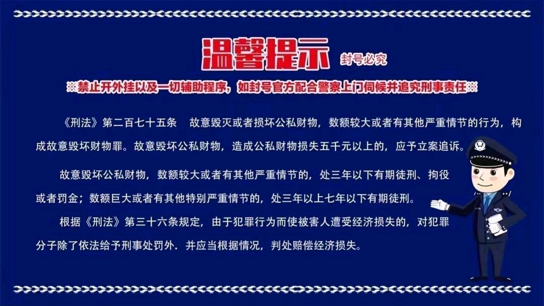 本公司所有账号已在武汉市公安局申报虚拟财产保护所有开挂开美化包等第三方违规软件