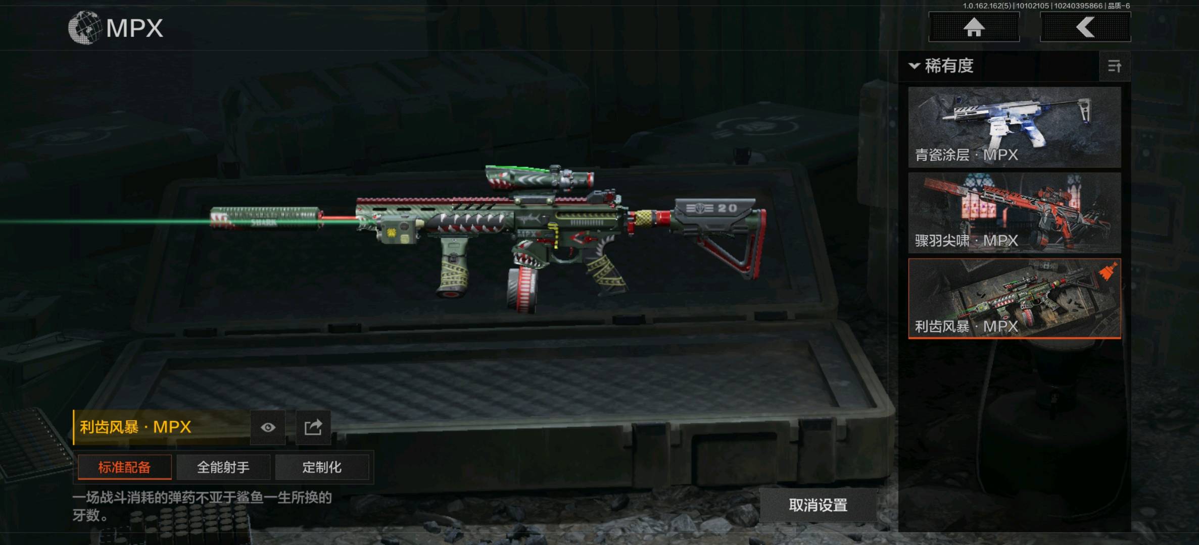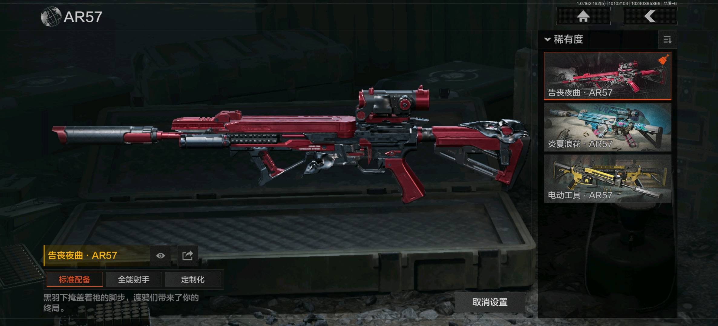 告丧夜曲AUG,告丧夜曲AR57,骤羽尖啸M4A1,竞技M4A1,竞技MDR,鱼跃丹青AK102,火力倾泻AUG,赢家F2000,炎夏浪花AR57,狂怒荣耀AEK,骑士之剑ACE31,冬日姜兵SCAR,百锻寒芒T951,利齿风暴T03,百锻寒芒T03,骤羽尖啸AK12;利齿风暴MPX,炎夏浪花MP5,骤羽尖啸MPX,高塔之内P90,利齿风暴T79,超越自我Vector9;高塔之内VSS,竞技M110;饰金AX50,超越自我AR30,骑士之剑SJ16;狂怒荣耀RPK16;赢家G18C