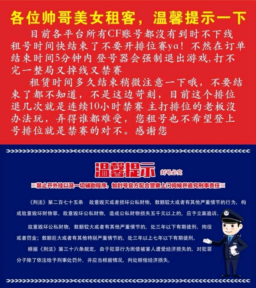 为方便他人和自己下一次租号,打排位时请一定不要退赛,频繁退赛则会导致排位禁赛,若经发现一律拉黑,也去广大租友手下留情。
