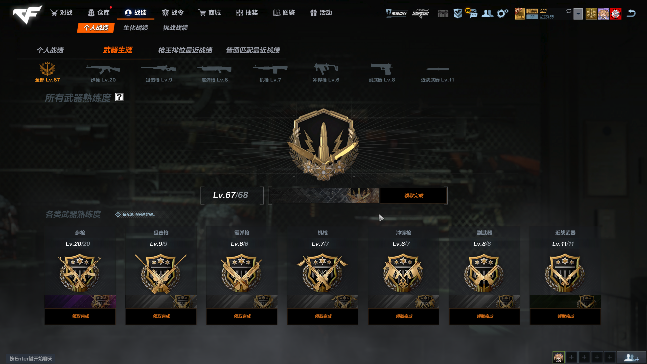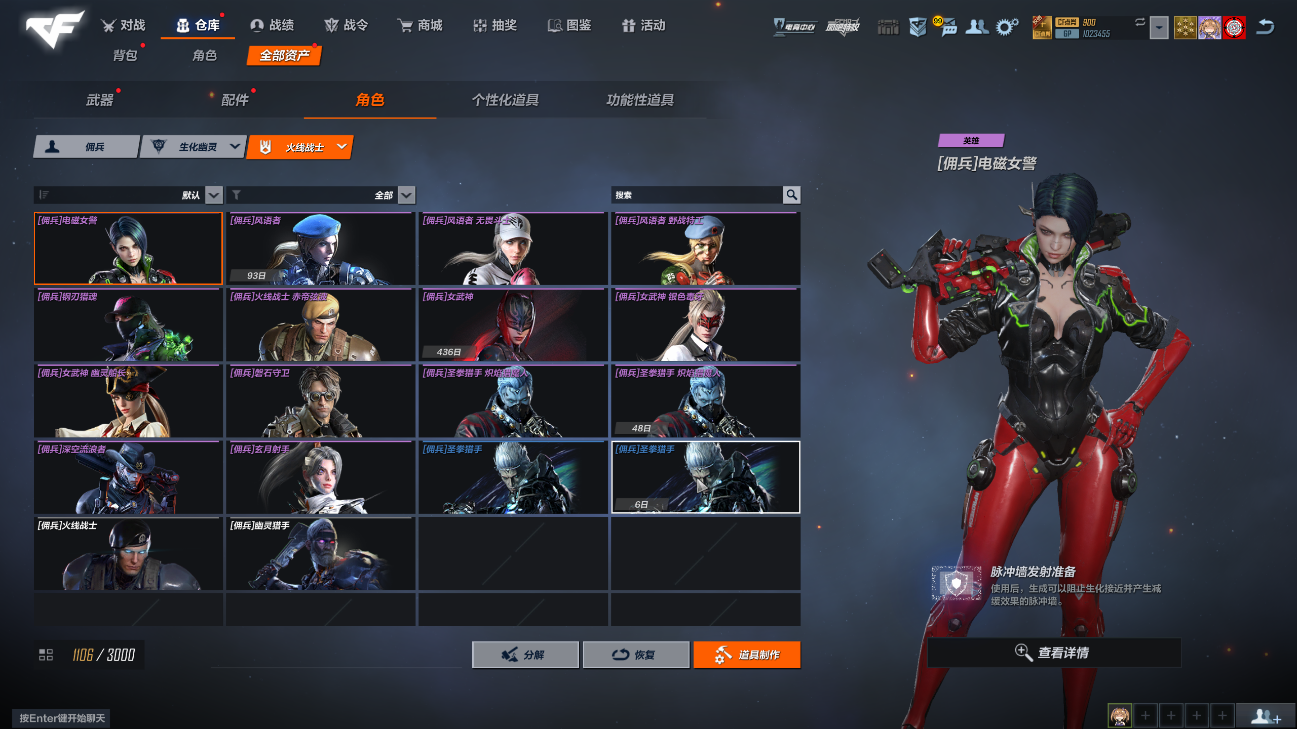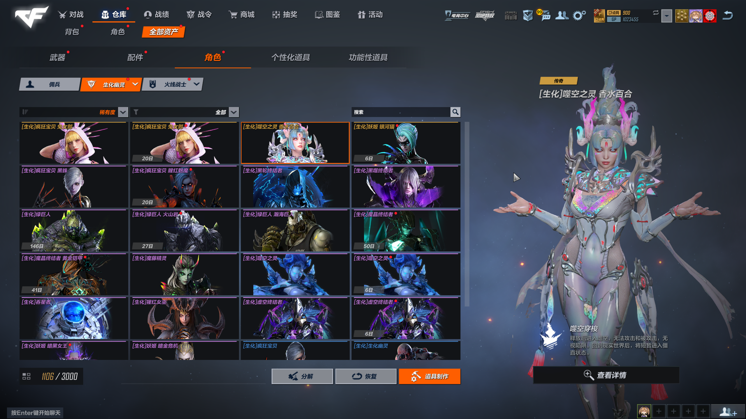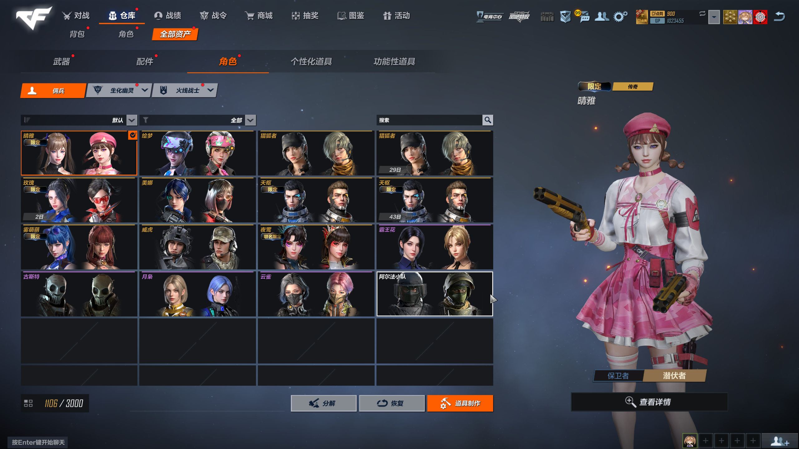 生化号,主要打怒气和追击。武器熟练度全满,主要有的人物有晴雅,雾萌萌,夜莺。追击人物有比如阿飘和香水百合,魔晶,小黑子,女巫,太空人,英雄有牛仔,女警,磐石,玄月全都有。怒气有猴子和皮肤,陀螺人,虚空,黑轮,魔腾,女鬼兔女郎都有。枪皮数量一般,枪皮有图,比不上富哥,够用就行。