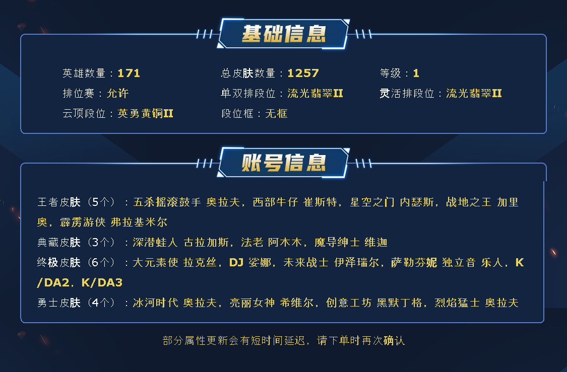 ~~喜欢记得收藏~~可排位~~1255皮全英雄~~租之前尽量查一下游戏ID,确保段位是您需要的,避免浪费您的时间~~请勿挂机逃跑故意送人头,谢谢合作,谢谢~~