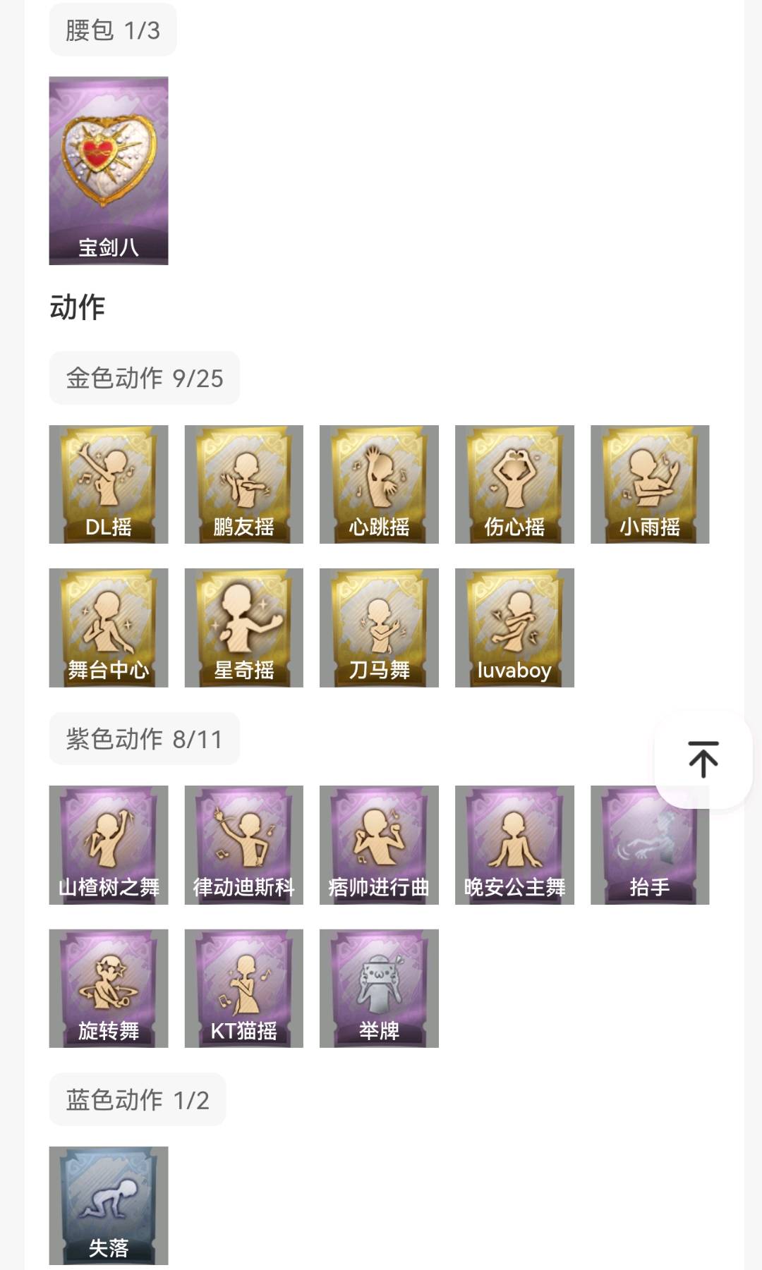 【动作】luvaboy、刀马舞、DL摇、鹏友摇、心跳摇、伤心摇、小雨摇、舞台中心、星奇摇、山楂树之舞、律动迪斯科、痞帅进行曲、举牌、晚安公主舞、抬手、旋转舞、KT猫摇、失落