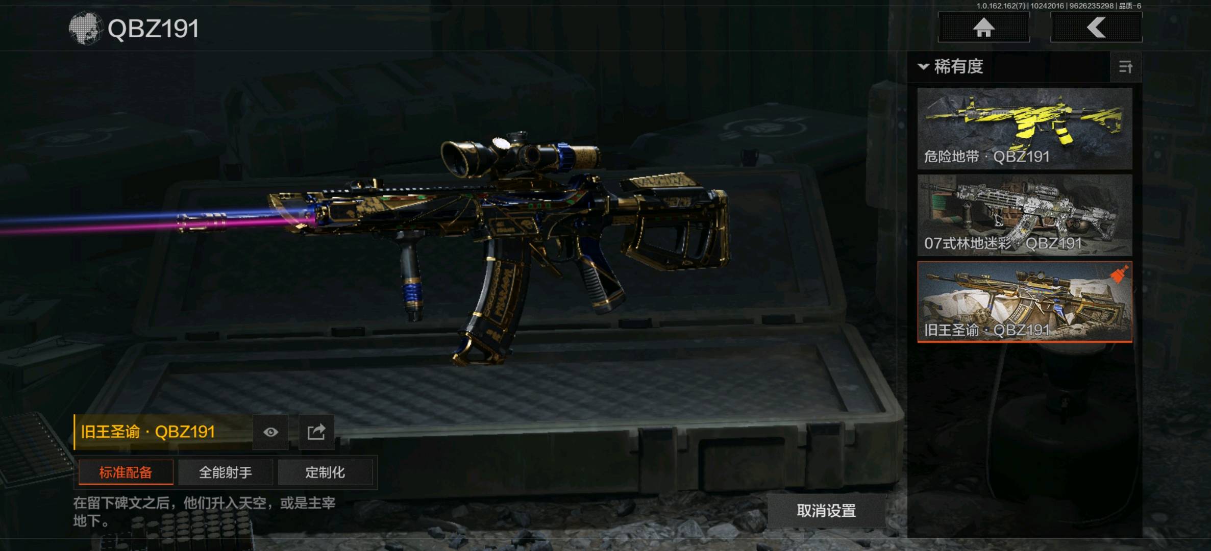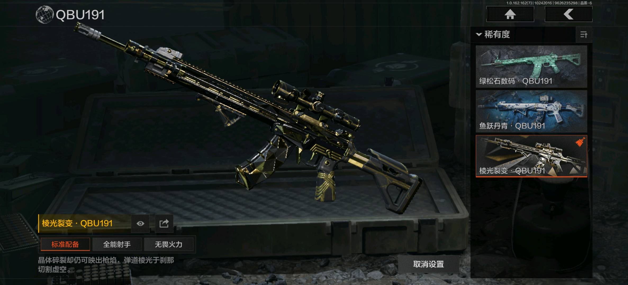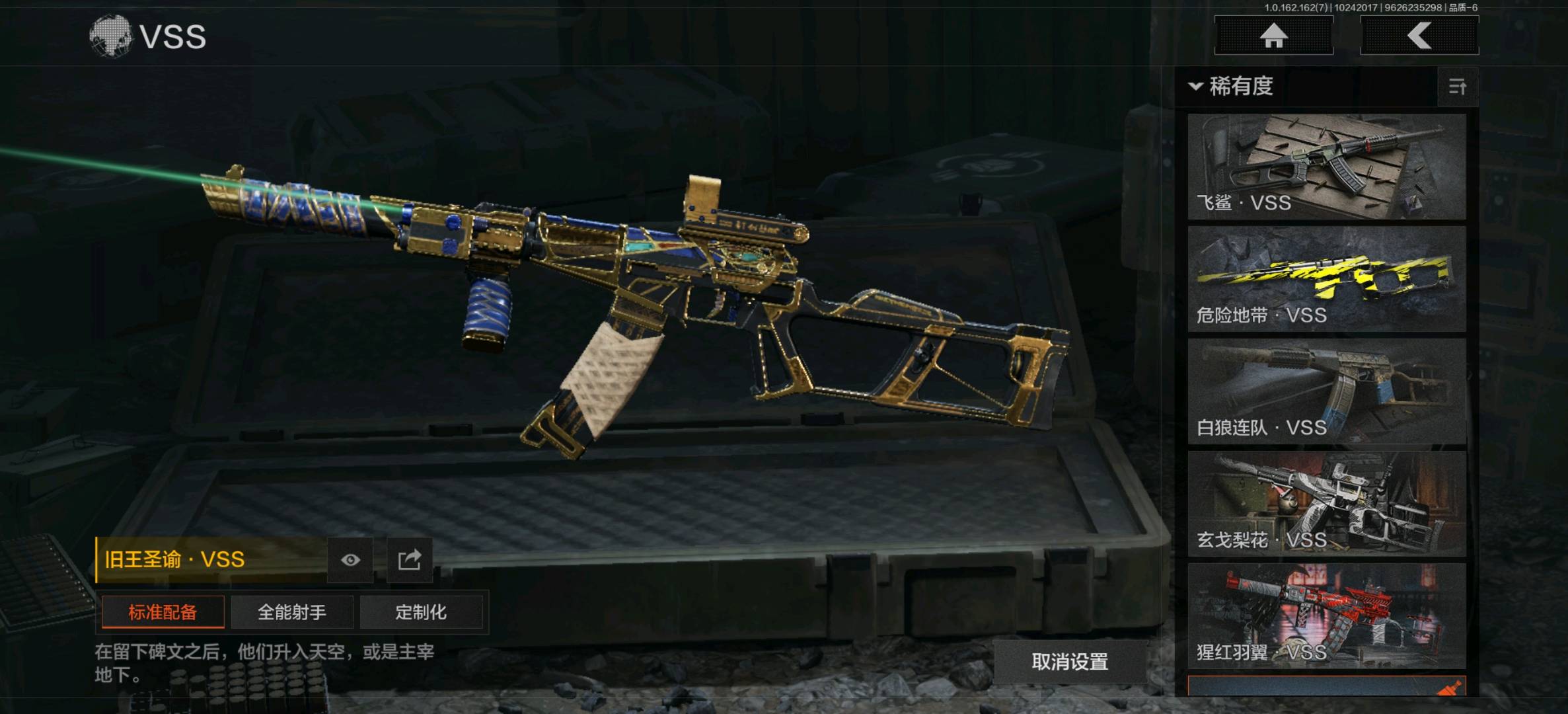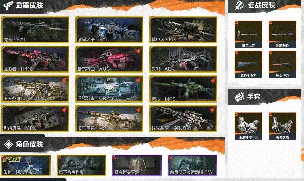 竞技MP5,利齿风暴MPX,玄戈梨花MPX,雪山之王MPX,涂鸦MPX,灰鼠幻歌P90,利齿风暴T79,鱼跃丹青T85,伦琴计量Vector45,狂怒荣耀vector9,恶念Vector9,旧王圣谕VSS,棱光裂变QBU191,玄戈梨花VSS,白狼连队VSS,典礼武备MK14,骑士之剑MK14,竞技M110,缟兵玄墨M110,午夜梦魇M110,全地形数码M110,鱼跃丹青QBU191,棱光裂变莫辛,白垩游魂莫辛,噤声者莫辛;飞鲨RPK16,典礼武备M249;无畏USAS12;