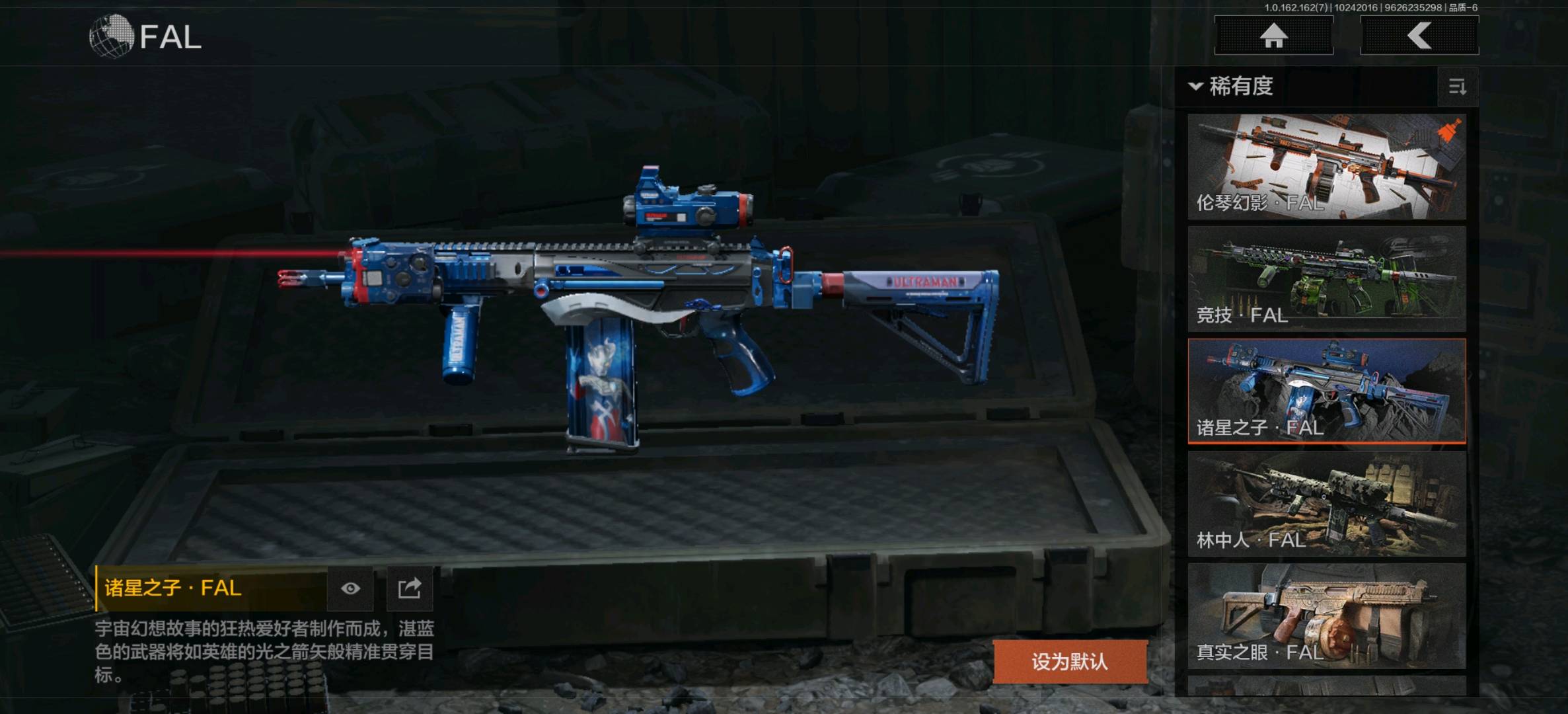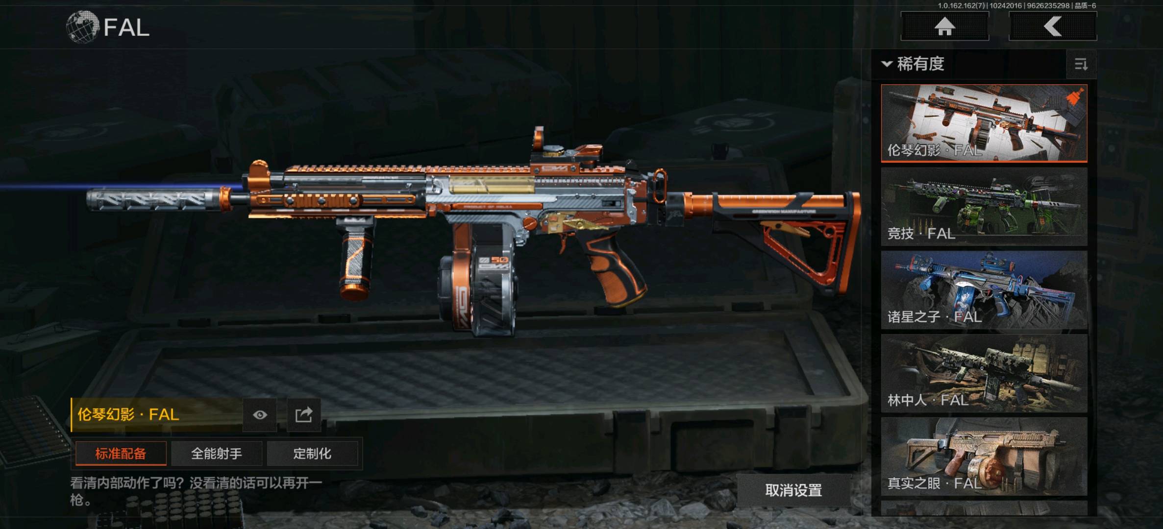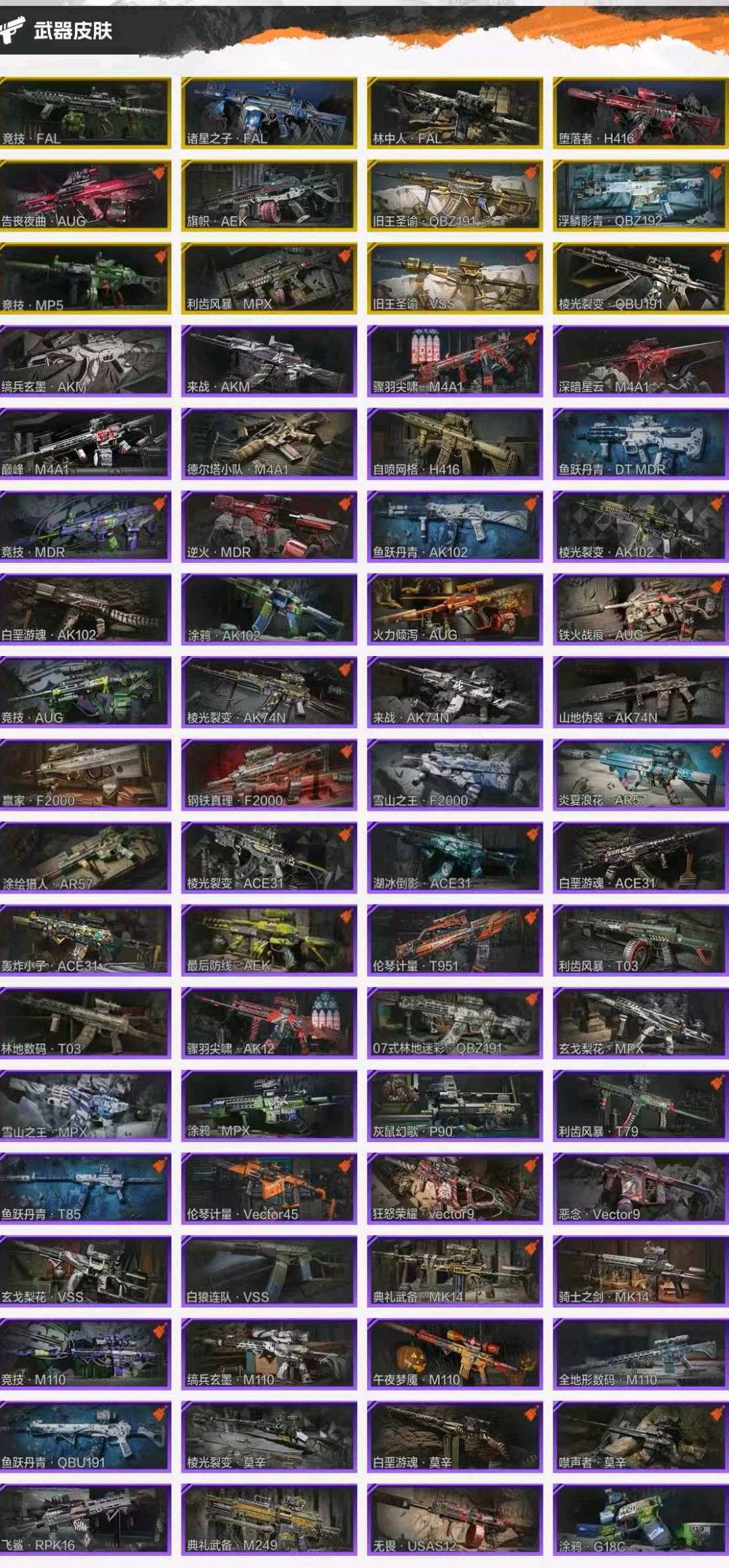 竞技FAL,诸星之子FAL,林中人FAL,堕落者H416,告丧夜曲AUG,旗帜AEK,旧王圣谕QBZ191,浮鳞影青QBZ192,缟兵玄墨AKM,来战AKM,骤羽尖啸M4A1,深暗星云M4A1,巅峰M4A1,德尔塔小队M4A1,自喷网格H416,鱼跃丹青DTMDR,竞技MDR,逆火MDR,鱼跃丹青AK102,棱光裂变AK102,白垩游魂AK102,涂鸦AK102,火力倾泻AUG,铁火战痕AUG,竞技AUG,棱光裂变AK74N,来战AK74N,山地伪装AK74N,赢家F2000,钢铁真理F2000,雪山之王F2000,炎夏浪花AR57,涂绘猎人AR57,棱光裂变ACE31,湖冰倒影ACE31,白垩游魂ACE31,轰炸小子ACE31,最后防线AEK,伦琴计量T951,利齿风暴T03,林地数码T03,骤羽尖啸AK12,07式林地迷彩QBZ191;