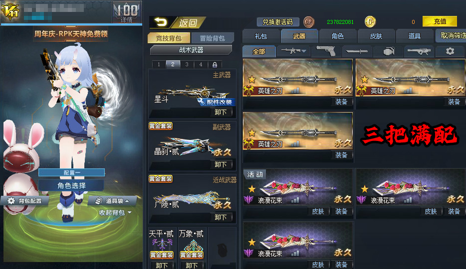 此号满配配件超乎你的想象!五满配耀光三满配英雄之刃!满配光棱!带皮不死鸟虚空连弩!
