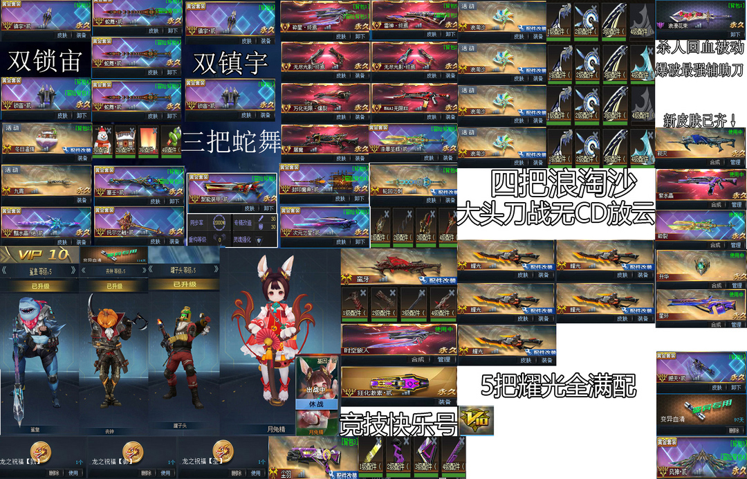 经典变异:拥有全部经典变异体(都有皮肤)12面具原地复活轻松破点抓人!三把满配英雄之刃,冥蛇疾风体,天火使者爽玩2018频道!双无尽光影带皮,满配瞬影满配光棱满配虚空连弩满配虚空漫游数据魔方贰满配镇压者带皮满配戏法幻刃满配含光承影带皮爽玩2020频道!