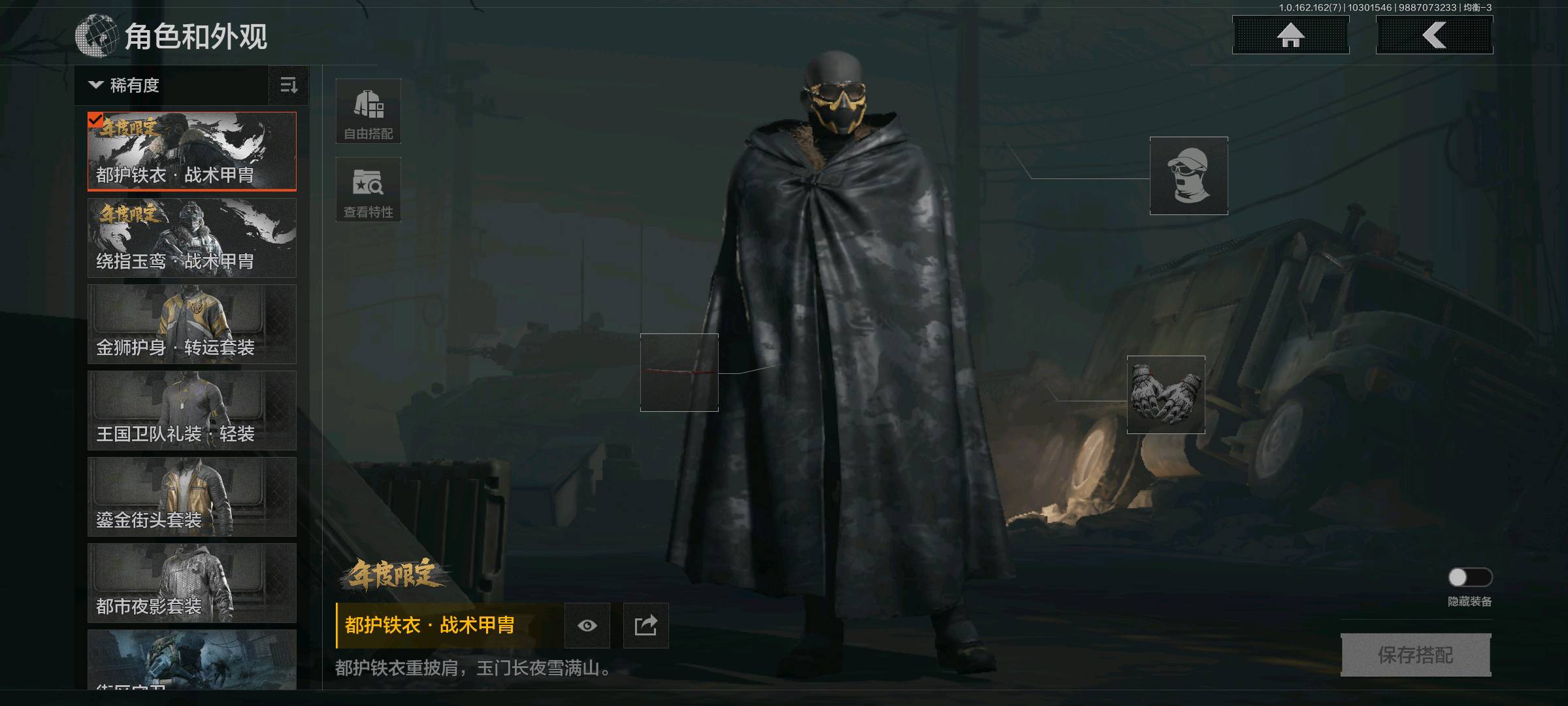 【角色皮肤】:都护铁衣战术甲胄,绕指玉鸾战术甲胄,鎏金街头套装,都市夜影套装;玉鸾挂枝手套,角弓得控手套;