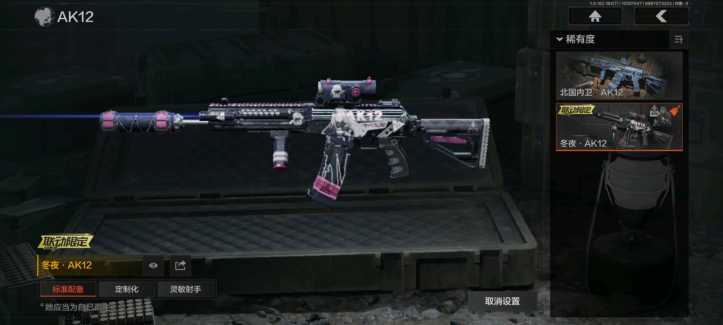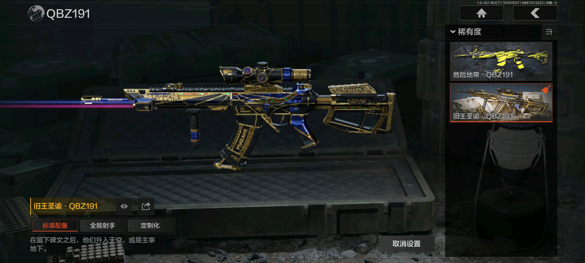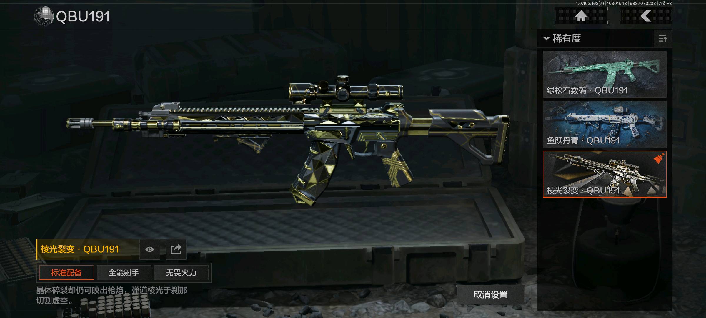 棱光裂变QBU191,高塔之内VSS,炎夏浪花VSS,缟兵玄墨VSS,玄戈梨花VSS,典礼武备MK14,骑士之剑MK14,鱼跃丹青M110,缟兵玄墨M110,玄戈梨花M110,鱼跃丹青QBU191;长缨风掣AX50,棱光裂变莫辛,白色丧钟莫辛,超越自我AR30,骑士之剑SJ16;长缨风掣RPK16,娜迦RPK16,典礼武备M249;伦琴计量SKS;涂鸦G18C;