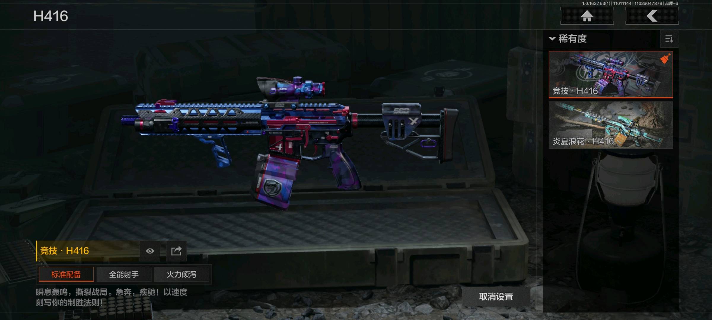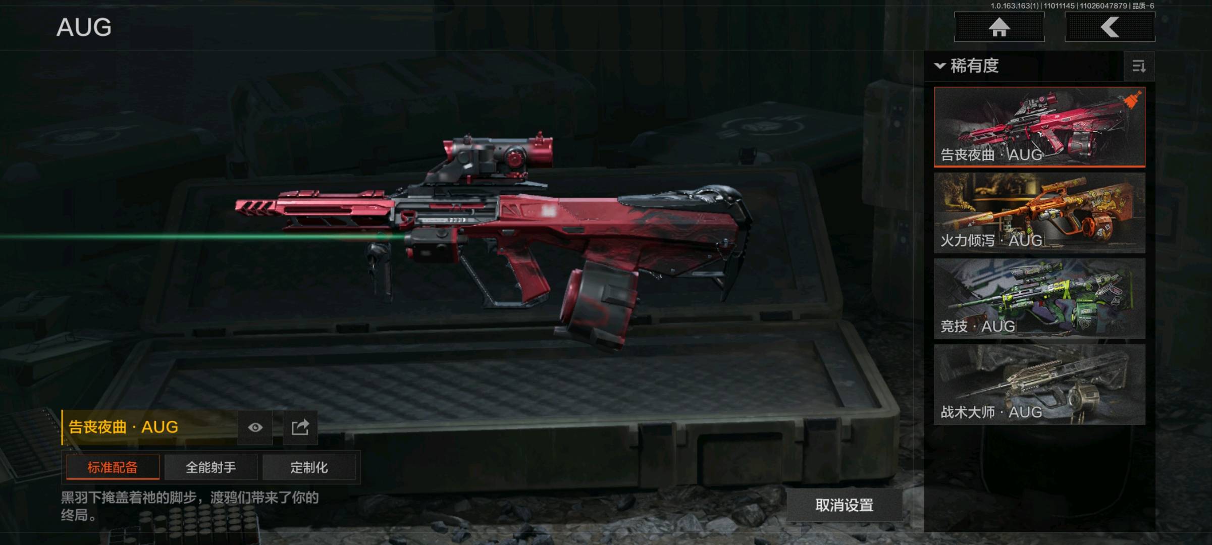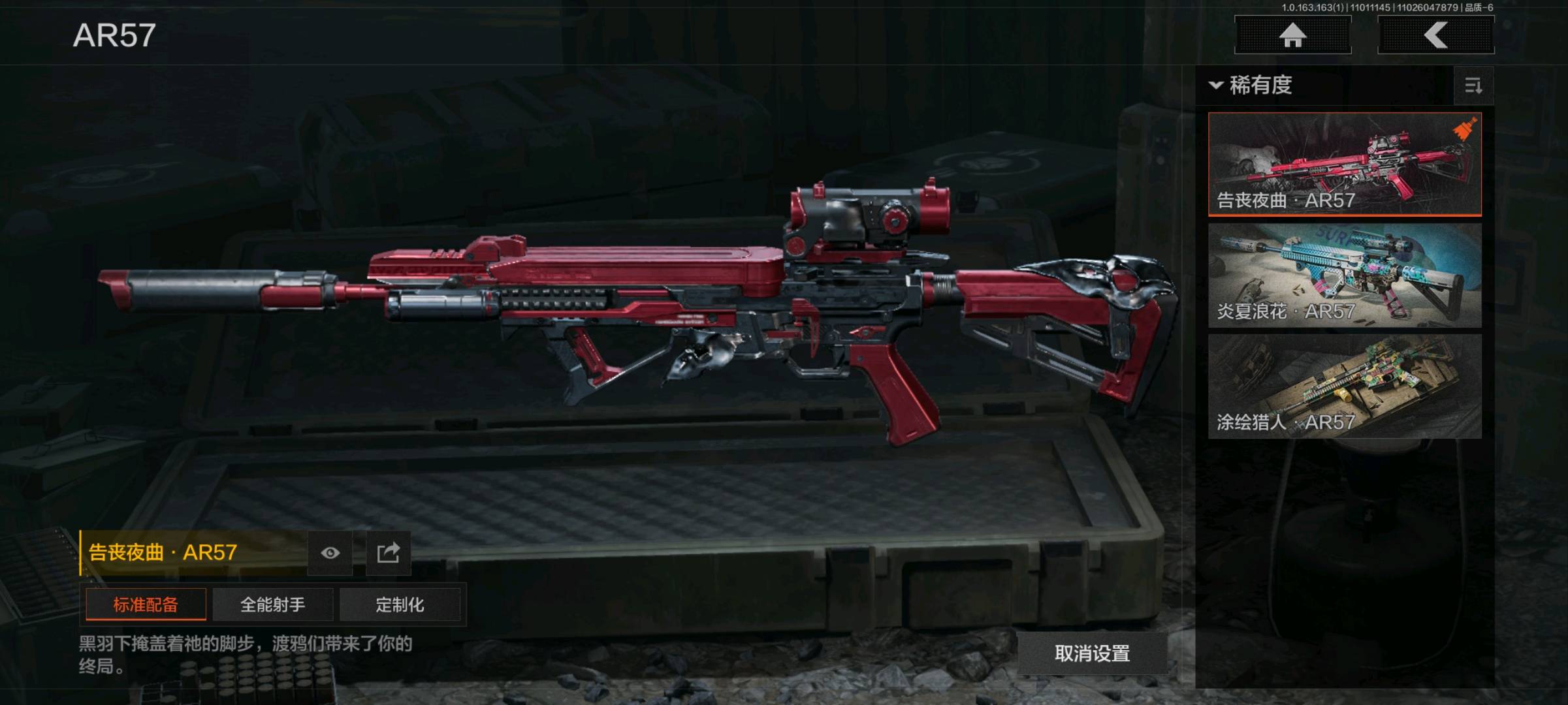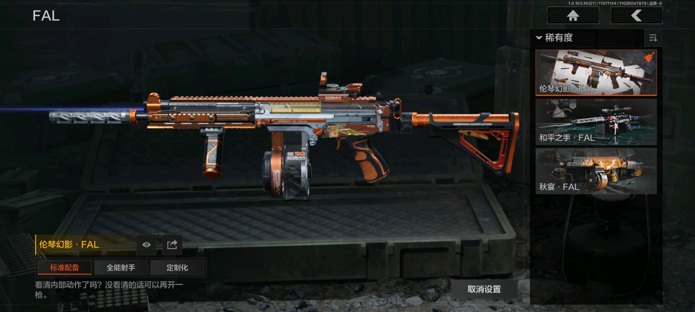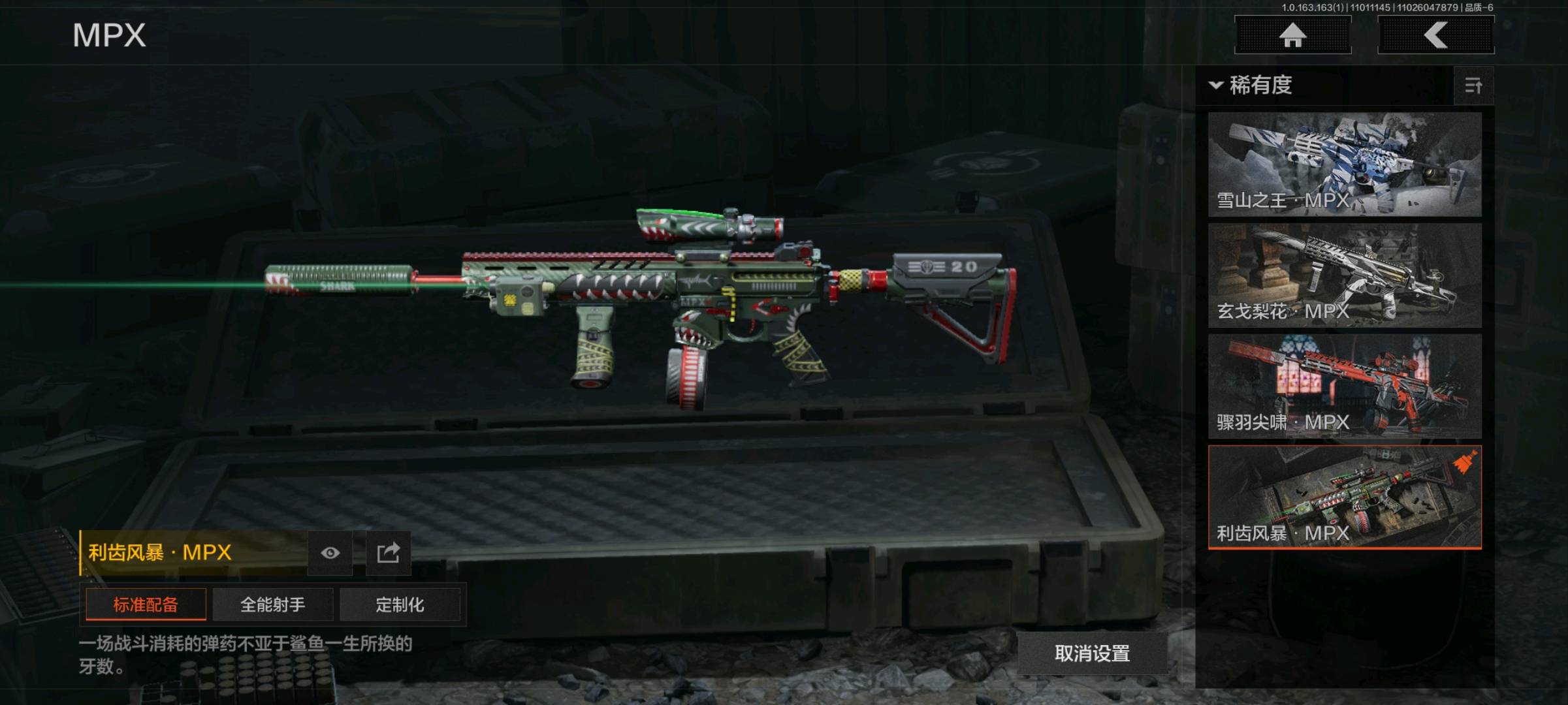 伦琴幻影FAL,竞技H416,告丧夜曲AUG,告丧夜曲AR57,旗帜AEK,旧王圣谕QBZ191,和平之手FAL,棱光裂变AKM,缟兵玄墨AKM,来战AKM,骤羽尖啸M4A1,竞技M4A1,炎夏浪花H416,竞技MDR,北国内卫MDR,鱼跃丹青AK102,棱光裂变AK102,火力倾泻AUG,竞技AUG,伦琴计量AK74N,棱光裂变AK74N,来战AK74N,骑士之剑AKS74U,最后防线AKS74U,逆火玄石F2000,炎夏浪花AR57,涂绘猎人AR57,棱光裂变ACE31,最后防线AEK,北国内卫AN94,典礼武备Groza,伦琴计量T951,利齿风暴T03,鱼跃丹青MCX,典礼武备MCX,骤羽尖啸AK12,火绒AK12,07式林地迷彩QBZ191;利齿风暴MPX,湖冰倒影MP5,骤羽尖啸MPX,玄戈梨花MPX,雪山之王MPX,利齿风暴T79;