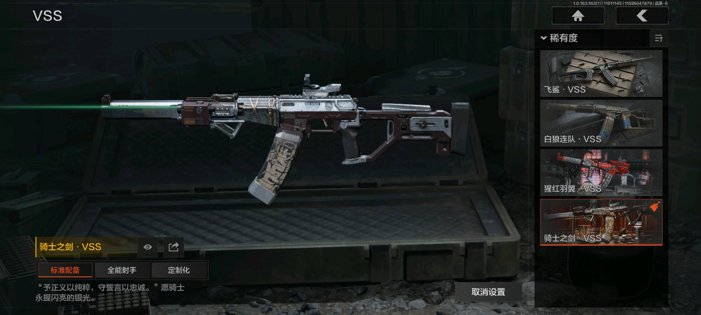 骑士之剑VSS,棱光裂变QBU191,白狼连队VSS,典礼武备MK14,骑士之剑MK14,焰色反应M110,鱼跃丹青QBU191,棱光裂变莫辛,边缘矢量AX50;逆火玄石DP12,伦琴计量USAS12,无畏USAS12;秩序G18C,白貂F57