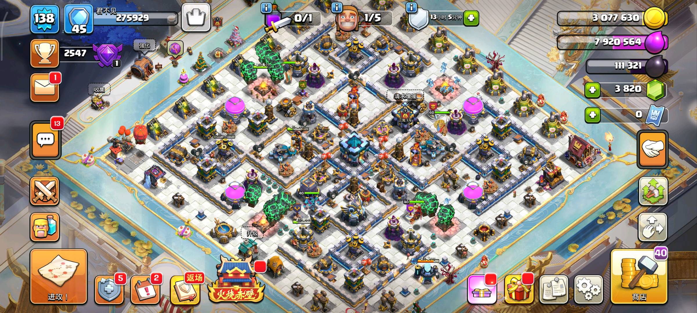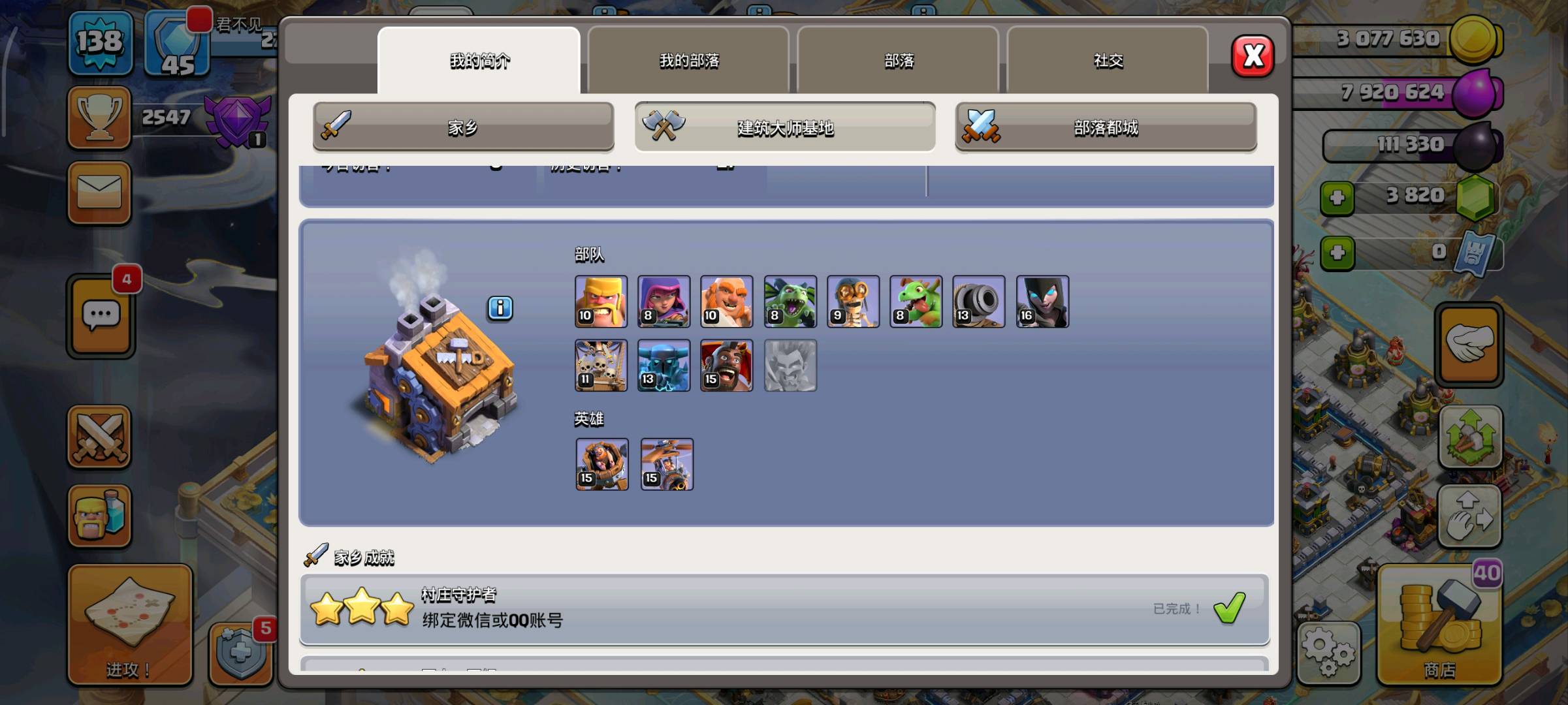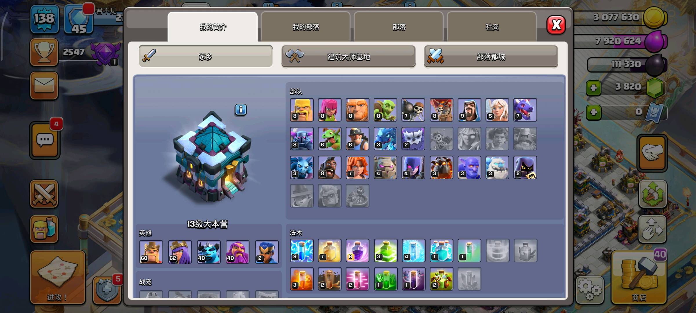 该账号拥有13级大本营,建筑、兵种、英雄等多维度发育成熟。部队方面,野蛮人、弓箭手、巨人等基础兵种均达8级,还有雷电飞龙、超级法师等强力兵种助力攻城;英雄养成出色,野蛮人之王60级、弓箭女皇62级、亡灵王子40级、大守护者40级,战力拉满;法术种类丰富且等级不低,雷电法术9级、治疗法术7级等,能应对各种战局。建筑大师基地也有不错发展,部队和英雄等级可观,可解锁多样玩法。