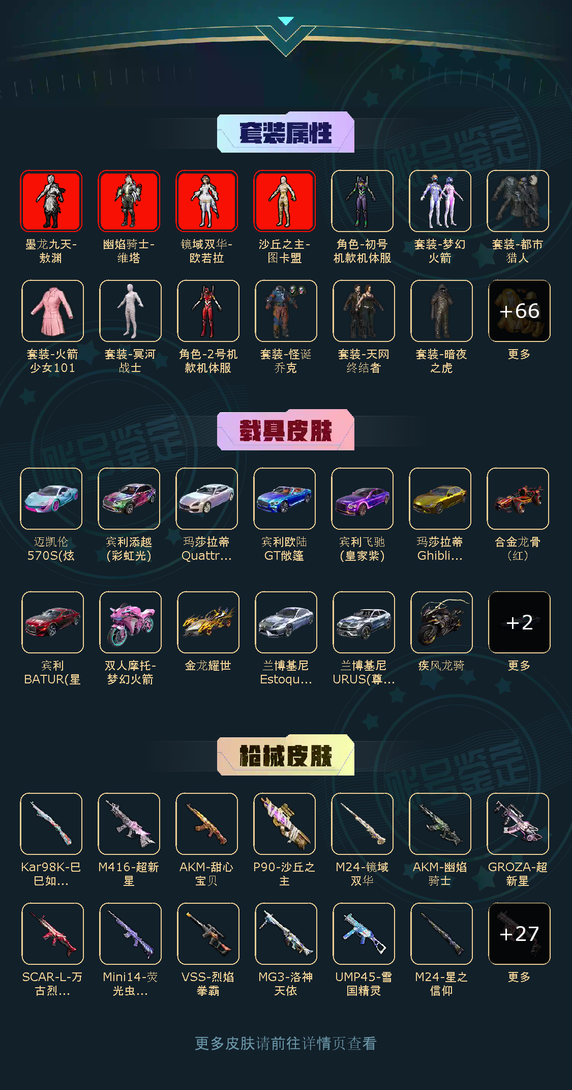 苹果V-4红装11稀有16载具67粉装40特效枪47热门380套装494枪皮 295539热力值 30印记 历史超级王牌22星 【4红装】 幽焰骑士-维塔 (1级) 墨龙九天-敖渊 (1级) 镜域双华-欧若拉 (1级) 沙丘之主-图卡盟 (2级) 【11稀有】 火箭少女101 木乃伊 奇异狩猎者 赤蝎幽灵 寒蝎幽灵 AWM-黄金龙骨 M416-星际漫游 都市猎人 派对舞王 天网终结者 派对舞王(金靴子) 【16载具】 宾利飞驰皇家紫 (4级) 宾利添越(彩虹光) (4级) 宾利欧陆GT深空蓝 (4级) 玛莎拉蒂Q幻星粉 (2级) 玛莎拉蒂金色 兰博轿车尊享铂 兰博SUV尊享铂 宾利BATUR(星火红) (2级) 迈凯伦570S炫冰蓝 (2级) 金龙耀世 合金龙骨红色 疾风龙骑 照夜玉狮子 双人摩托梦幻火箭 塞莎深潜蓝 (1级) 萌酷奶龙僚机 【67粉装】 红螳螂 紫螳螂 万古烈焰 圣堂之誓 梦幻火箭 蝶舞迷情 雪国幻梦 盖世英雄 水仙星 傲傲奶龙 宝贝奶油派 天使彩虹糖 甜心巧克力 洛天依 金风玉露 深海曼妙 月影灵韵 天星战神 炫光之旅 火曜朱雀 金曜白虎 怪诞乔克 冰炎战车 守护骑士 深渊皇后 双面双生 白勺歌姬 双星鱼跃 紫钛骑兵 射星猎手 室女星神 闲梦青缨 宙之时溯 星云暗核 金属狂野 静灵氛围 垂柳戏鸭 缤纷油彩 放客神游 莲影清波 牧神之羯 快乐主宰 荒野猎神 PEL轰鸣竞梦者 星之信仰 数码大师 极限特训 未来战士 麻辣鲜香锅 第五大道 极致幻想 锦绣火鲤 迷蝶贵族 暗夜鎏金 香水柠檬 翡翠骑士 绚金战神 童趣迷兔 冰霜白皇 炙焰红王 暗翼战神 星之彼岸 紫电风暴 赤焰黑爵 沙场疾风 天之羽翼 蓝莓炮弹 【40特效枪】 SCAR-L-梦幻火箭 (1级) M416-五爪金龙 (1级) SCAR-L-万古烈焰 (8级) M416-心之恋语 (1级) M416-墨龙九天 (1级) M416-超新星 (7级) AKM-熔岩统帅 (1级) P90-沙丘之主 (3级) AKM-甜心宝贝 (2级) M24-星之信仰 (1级) AKM-幽焰骑士 (7级) UMP45-雪国精灵 (6级) Kar98K-巳巳如意 (5级) Kar98K-伏魔团 (1级) M762-甜蜜誓约 (1级) DP-28-豹影疾电 (5级) PKM-天星战神 (4级) AWM-花间之火 (5级) AUG-超新星 (4级) Mini14-荧光虫舞 (7级) Mk14-闲梦青缨 (5级) AMR-智耀战神 (5级) AMR-炫光之旅 (1级) M24-镜域双华 (3级) GROZA-香水柠檬 (4级) SCAR-L-童趣迷兔 (1级) AUG-星之彼岸 (1级) DP-28-圣堂之誓 (4级) AKM-梦之光华 (1级) 汤姆逊-冰川粉黛 (4级) 野牛-青空秋雨 (4级) VSS-烈焰拳霸 (1级) GROZA-超新星 (8级) P90-粉樱探戈 (5级) M16A4-垂柳戏鸭 (1级) M762-冷魅冰骑 (1级) Vector-灵感创作师 (5级) MG3-洛神天依 (6级) M249-蓝莓炮弹 (1级) 平底锅-林间仙鹿 (5级) 【47热门】 奇迹天团 龟仙人 星光纪元 暗夜之虎 太空漫步 雪山精英 东方飞龙 潮萌小黄鸭 爱崽白熊 梦魇先生 万圣娃娃 鹰眼刺客 软萌银虎 奇迹天团 黄金大亨 暗夜之虎 迅捷狂鲨 大橘为重 浪客战士 裁决冥王 神秘黑猫 暗夜契约 暗影哥特 SS1特训 团圆交子 瑞龙福将 纯白誓言 忍者信条 水银刺客 漫步者 冰爽海盐 韶华初心 影双刃 娴静芝兰 静谧青瓷 机械英豪 破蛋小黄鸡 风华少年志 白月香洋装 软嫩糖心蛋 黑色刀锋 军刀雅典娜 弄潮海豚 M416-快乐主宰 M762-瑞龙福将 Kar98K-深海曼妙 M24-香水柠檬 【13飞行器】 龙翔九天飞行器 锦绣火鲤飞行器 心之恋语飞行翼 梦幻火箭飞行器 春暖花开飞行器 相思残雪飞行器 星之信仰飞行翼 深海曼妙飞行器 镜光幻境飞行翼 歌者泠鸢飞行器 千面幻镜飞行器 冷魅冰骑飞行器 PEL轰鸣竞梦者飞行器 【14头盔】 银河战甲头盔 梦幻火箭头盔 雪国精灵头盔 金曜白虎头盔 甜心宝贝头盔 百万伏特头盔 幻影战神头盔 金风玉露头盔 金属狂野头盔 静灵氛围头盔 缤纷油彩头盔 放客神游头盔 心之恋语头盔 花间之火头盔 【20背包】 梦幻火箭背包 雪国精灵背包 金曜白虎背包 甜心宝贝背包 百万伏特背包 幻影战神背包 金风玉露背包 金属狂野背包 静灵氛围背包 缤纷油彩背包 放客神游背包 萌熊伴侣背包 潮萌小黄鸭背包 深海曼妙背包 神秘黑猫背包 古堡领主背包 金羽特工背包 甜蜜誓约背包 心之恋语背包 花间之火背包 营地ID