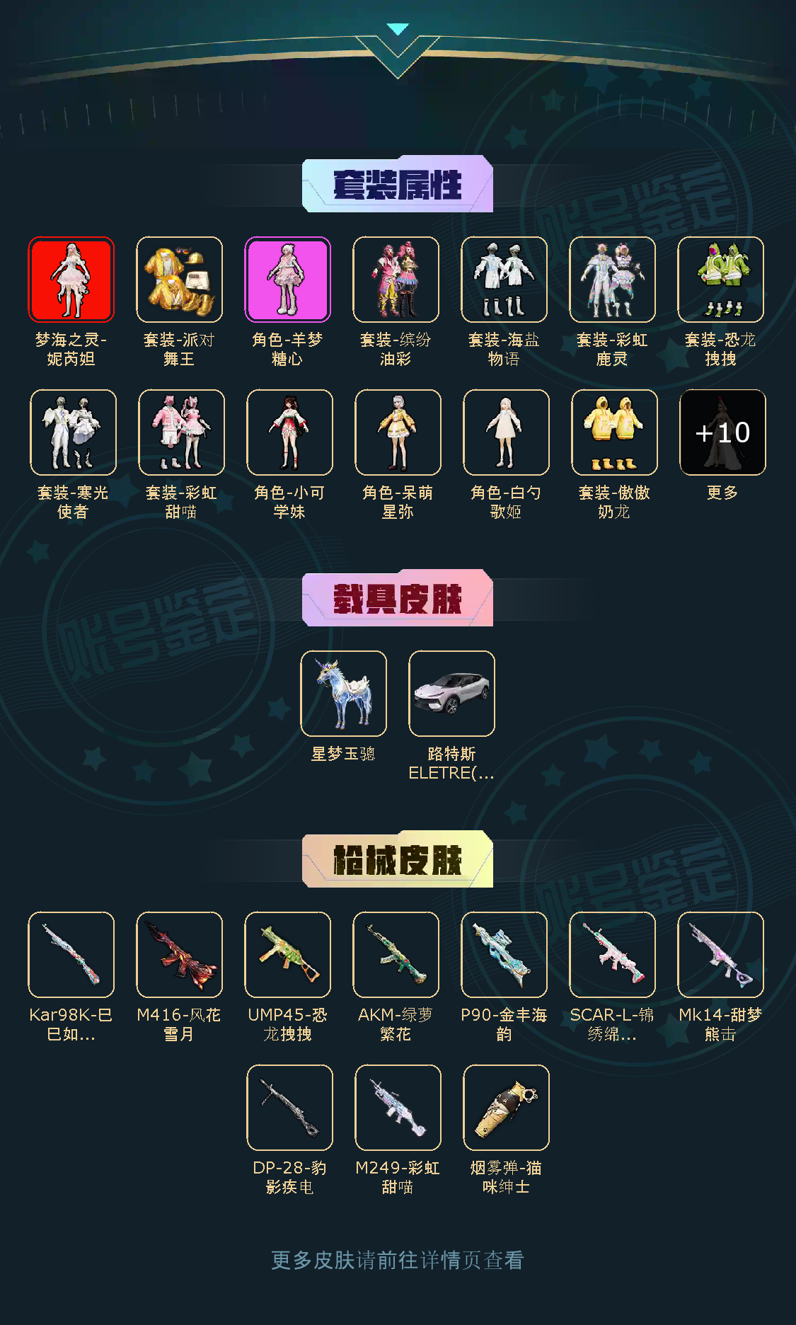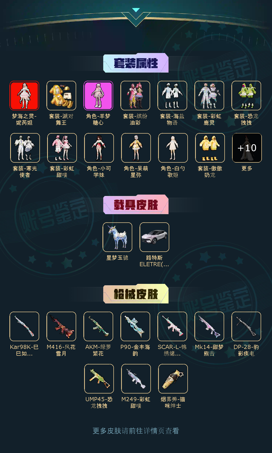 【稀有资产】梦海之灵-妮芮妲[4级]/套装-彩虹甜喵/角色-羊梦糖心/角色-严莉莉/套装-缤纷油彩/M416-风花雪月/烟雾弹-猫咪绅士/套装-派对舞王/套装-浪漫天命/套装-龟仙人/套装-软软马卡龙/套装-宝石天鹅/套装-狂沙舞者/套装-浪漫假日/套装-牛仔情诗/玩偶服-懒羊羊/角色-粉雾星云/角色-摩登魅猫