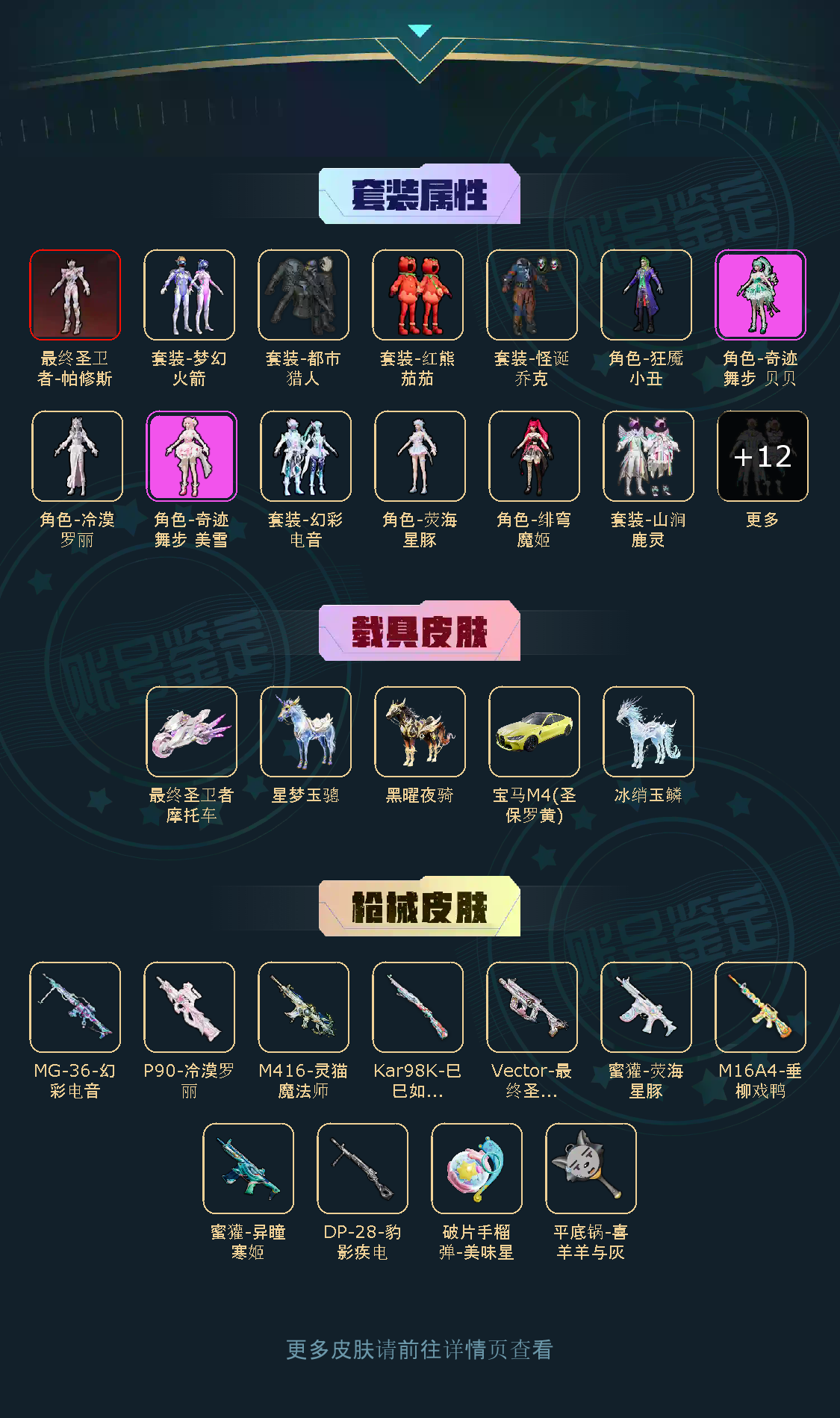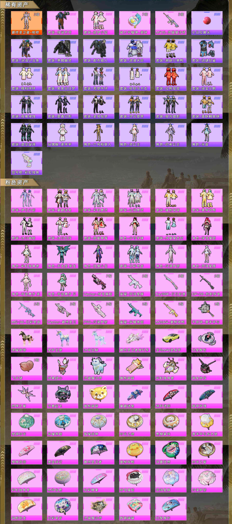 【稀有资产】最终圣卫者-帕修斯[3级]/套装-怪诞乔克/套装-甜梦小狐/破片手榴弹-美味星星糖/M416-灵猫魔法师/小丑红鼻头/套装-深海小丑鱼/套装-寒蝎幽灵/套装-都市猎人/套装-浪漫天命/套装-潮萌小黄鸭/套装-迅捷狂鲨/套装-糯粉咩咩/套装-兔兔白日梦/套装-荒原牛仔/套装-软软马卡龙/套装-红熊茄茄/套装-绒宝小鹅/套装-夜幕侵蚀/套装-墨青刃影/套装-圣穹绘梦/套装-次元竞界/套装-极光猎影/套装-香酥鲷鱼烧/套装-虚空漩涡/玩偶服-美羊羊/角色-六号稻草人/角色-灵公主/角色-时希公主/角色-乐音/信号枪-彩虹独角兽