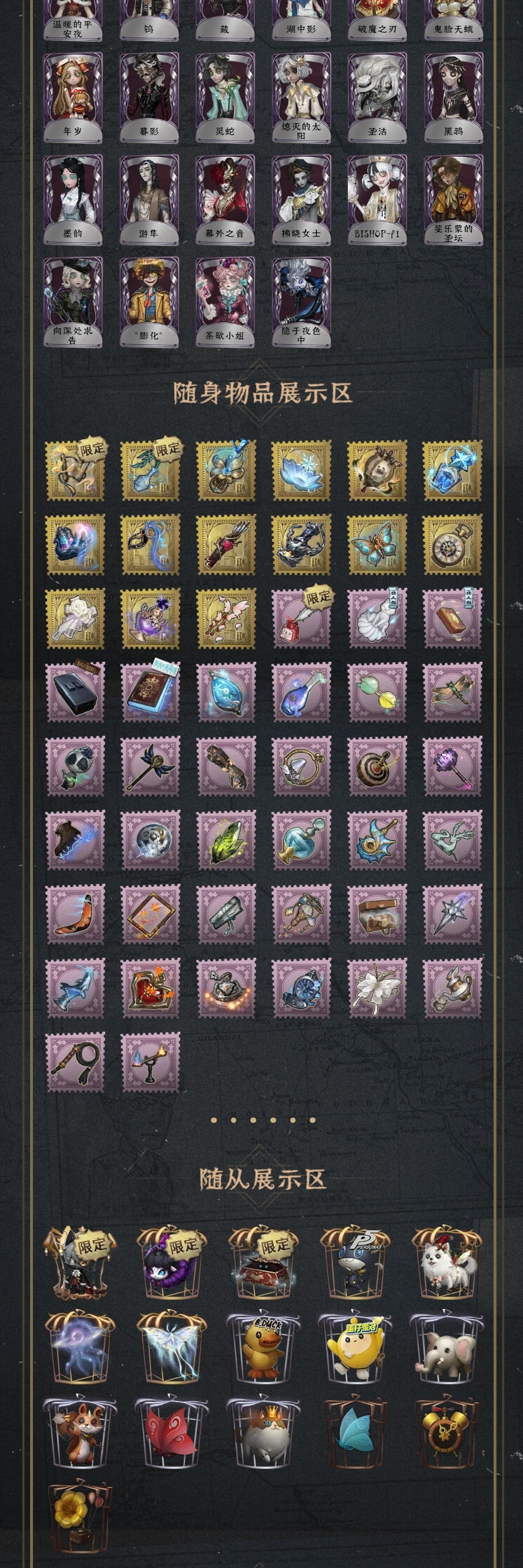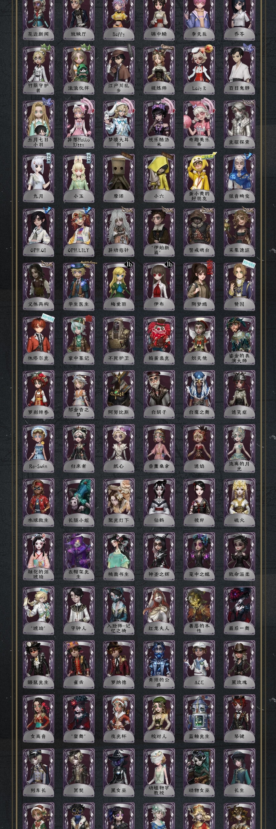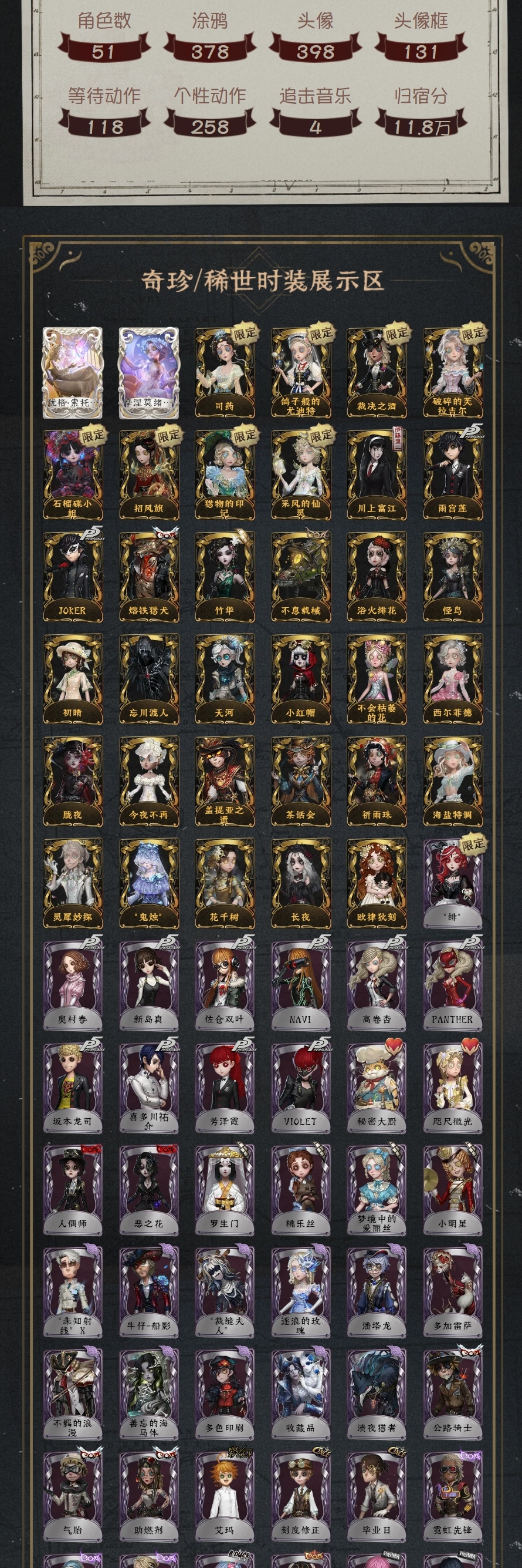 角色数51涂鸦378头像398头像框131等待动作118个性动作258追击音乐4归宿分11.8万犹格·索托斯之使摩涅莫绪涅之梦司药鸽子般的尤迪特裁决之酒破碎的芙拉吉尔石榴碟小姐招风旗猎物的印记采风的仙灵川上富江雨宫莲JOKER熔铁猎犬竹华不息载械浴火绯花怪鸟初晴忘川渡人天河小红帽不会枯萎的花西尔菲德胧夜今夜不再盖提亚之遗茶话会祈雨珠海盐特调灵犀妙探“鬼烛”花千树长夜欧律狄刻“绯”奥村春新岛真佐仓双叶NAVI高卷杏PANTHER坂本龙司喜多川祐介芳泽霞VIOLET秘密大厨咫尺微光人偶师恶之花罗生门桃乐丝梦境中的爱丽丝小明星“未知射线”X牛仔-船影“裁缝夫人”逐浪的玫瑰潘塔龙多加雷萨不羁的浪漫善忘的海马体多色印刷收藏品溃夜猎者公路骑士气胎助燃剂艾玛刻度修正毕业日霓虹先锋花边新闻放映厅Buffy锦中鳞李天辰乔苓竹荫守护者滚滚伙伴江户川乱步提炼师Lady K百目鬼静五月七日小羽异想Hello Kitty梦境大耳狗悦乐酷洛米奇趣美乐蒂先驱探索九月小玉摩诺小六蛋小黄的好朋友弦音畸变OPH.QIOPH.LILY异动指针“伊始新篇”警戒哨台采集速巡义体再构华生医生梅爱丽伊布陶梦嫣赞因休塔尔克掌中篆记不死护卫捣蛋裘克炽天使鎏金的表演大师罗刹绯春郁金香之梦阿努比斯白胡子白鹰之舞诡笑症Re-Swim归来者纸心香薰诡焰流离的月光水球救生长腿小姐聚光灯下仙鹤彼岸硫火融化的泪琥珀衣帽架先生桃面书生神圣之辉笼中之蝶致命温柔“琥珀”守钟人入殓师-记忆之骑红龙夫人善恶的本性最后一舞鼹鼠先生雀舌罗纳德青须的公爵ACE黑玫瑰女高音“宴舞”夜光杯校对人蓝釉先生琴键列车长冥契黑女巫动植物学教授动物女巫长生温暖的平安夜钨藏湖中影破魔之刃鬼天蛾年岁暮影灵蛇熄灭的太阳圣洁黑鸦墨韵游隼幕外之音拂晓女士BISHOP-f1斐乐蒙的圣坛向深处求告“膨化”茶歇小姐隐于夜色中图鉴内容来源于游戏数