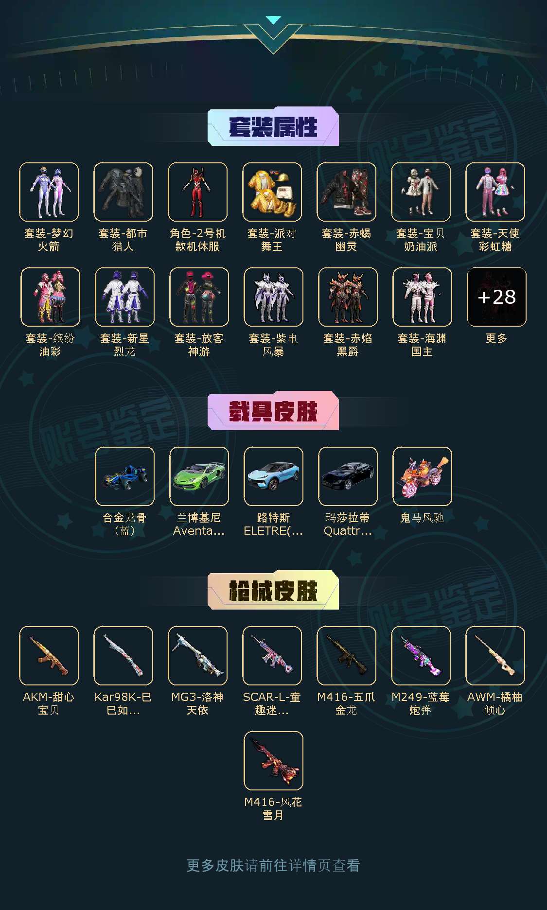 【稀有资产】角色-2号机款机体服/套装-彩虹甜喵/套装-缤纷油彩/AKM-甜心宝贝/M416-五爪金龙/M416-风花雪月/角色-8号机/角色-Mark.06/角色-明日香款战斗服/角色-零款战斗服/套装-派对舞王/套装-深海小丑鱼/套装-赤蝎幽灵/套装-都市猎人/套装-奇异狩猎者/套装-胖达圆圆/套装-浪漫天命/套装-暗影哥特/套装-迅捷狂鲨/套装-恶魔人蛛/套装-狂沙舞者/套装-冷酷挑战者