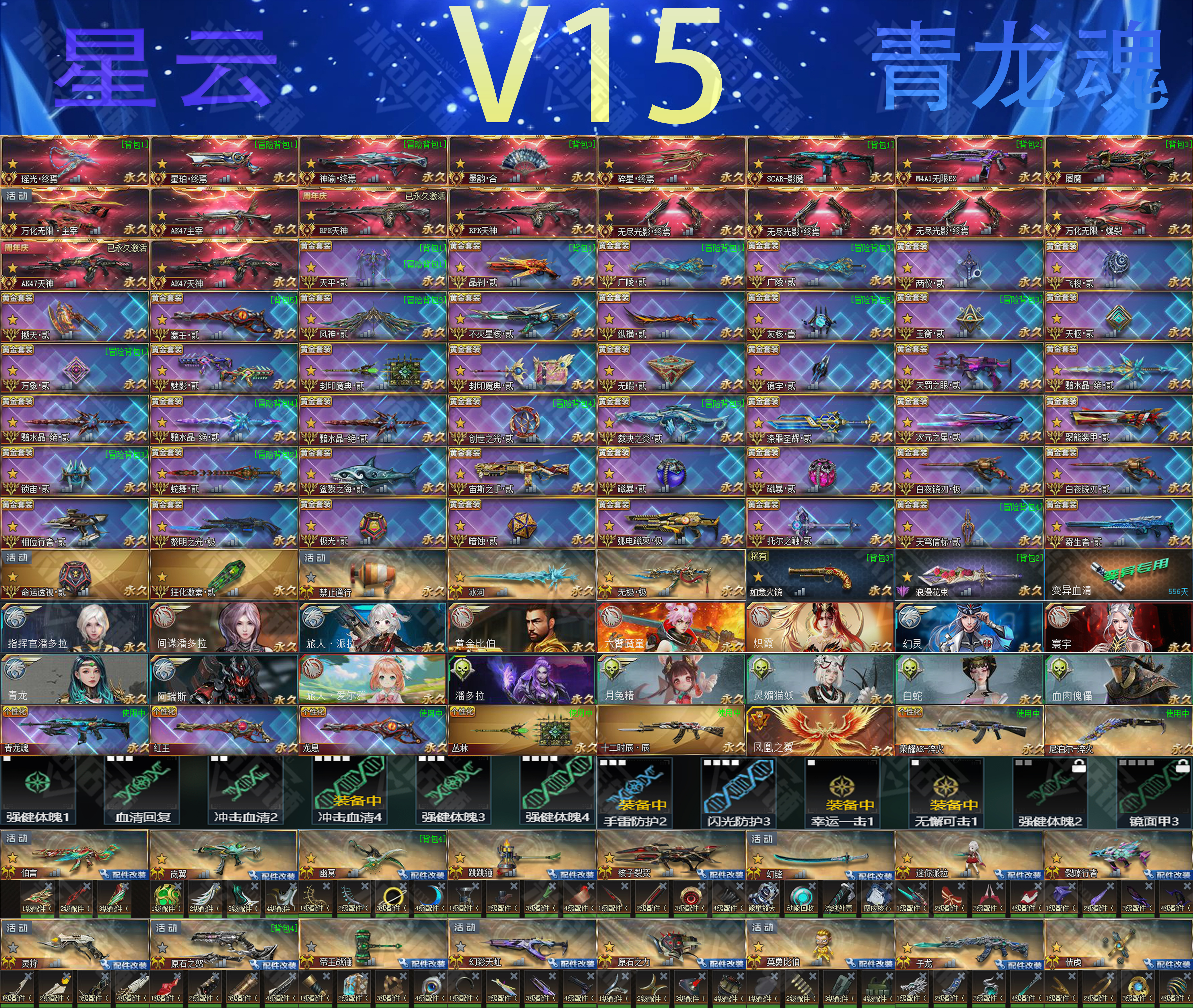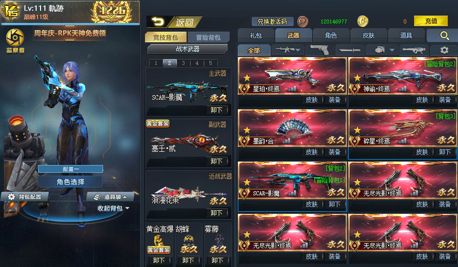传说武器:瑶光终焉◆星珀终焉◆◆神谕·终焉◆AK47主宰◆墨韵·合◆碎星·终焉◆SCAR-影魔◆无尽光影·终焉◆M4A1无限EX◆屠魔◆AK47天神◆万化主宰